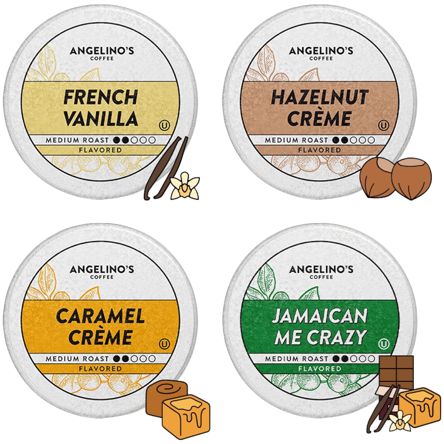- INCLUDES: Angelino's Flavored Variety brings you 96 single serving Keurig K-Cup compatible pods. Inside are four 24ct boxes: French Vanilla, Hazelnut Crème, Caramel Crème, Jamaican Me Crazy.