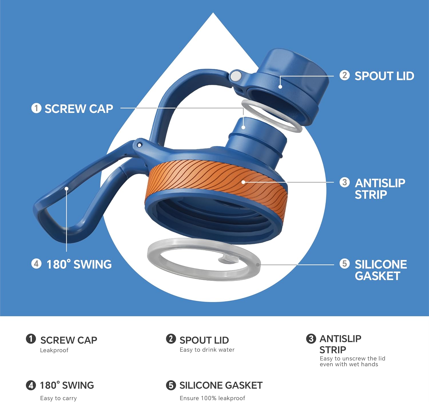 IDEUS Insulated Stainless Steel Water Bottle with 2 Leak-Proof Lids, Thermal Water Flask for Hiking Biking, 32oz, Bright Blue