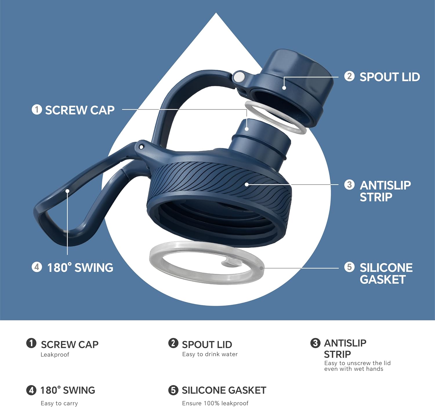 IDEUS Insulated Stainless Steel Water Bottle with 2 Leak-Proof Lids, Thermal Water Flask for Hiking Biking, 32oz, Navy Blue