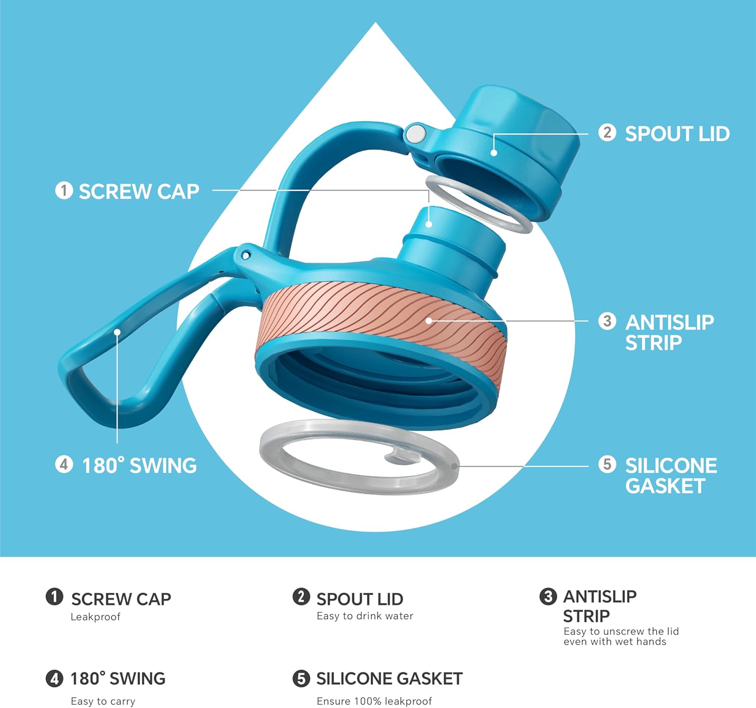 IDEUS Insulated Stainless Steel Water Bottle with 2 Leak-Proof Lids, Thermal Water Flask for Hiking Biking, 32oz, Blue Atoll