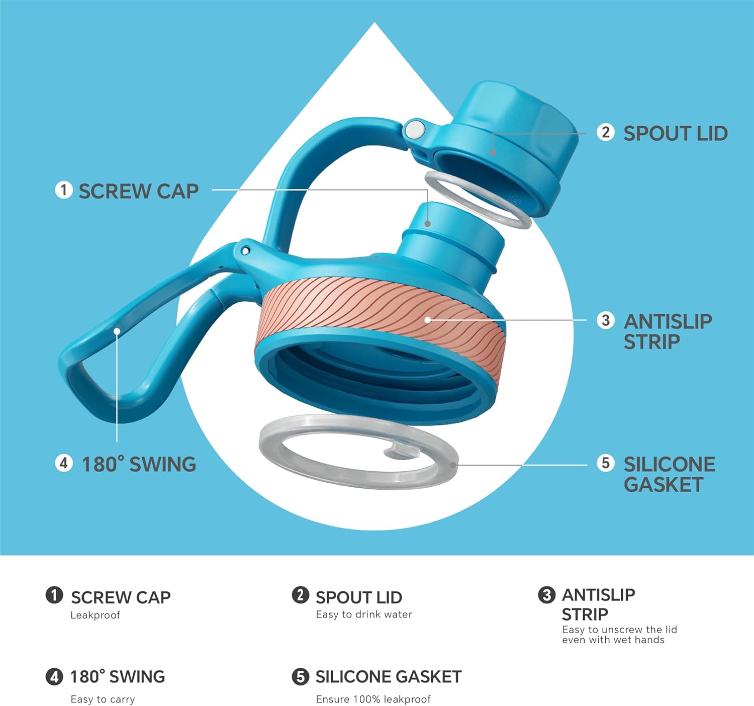IDEUS Insulated Stainless Steel Water Bottle with 2 Leak-Proof Lids, Thermal Water Flask for Hiking Biking, 18oz, Blue Atoll