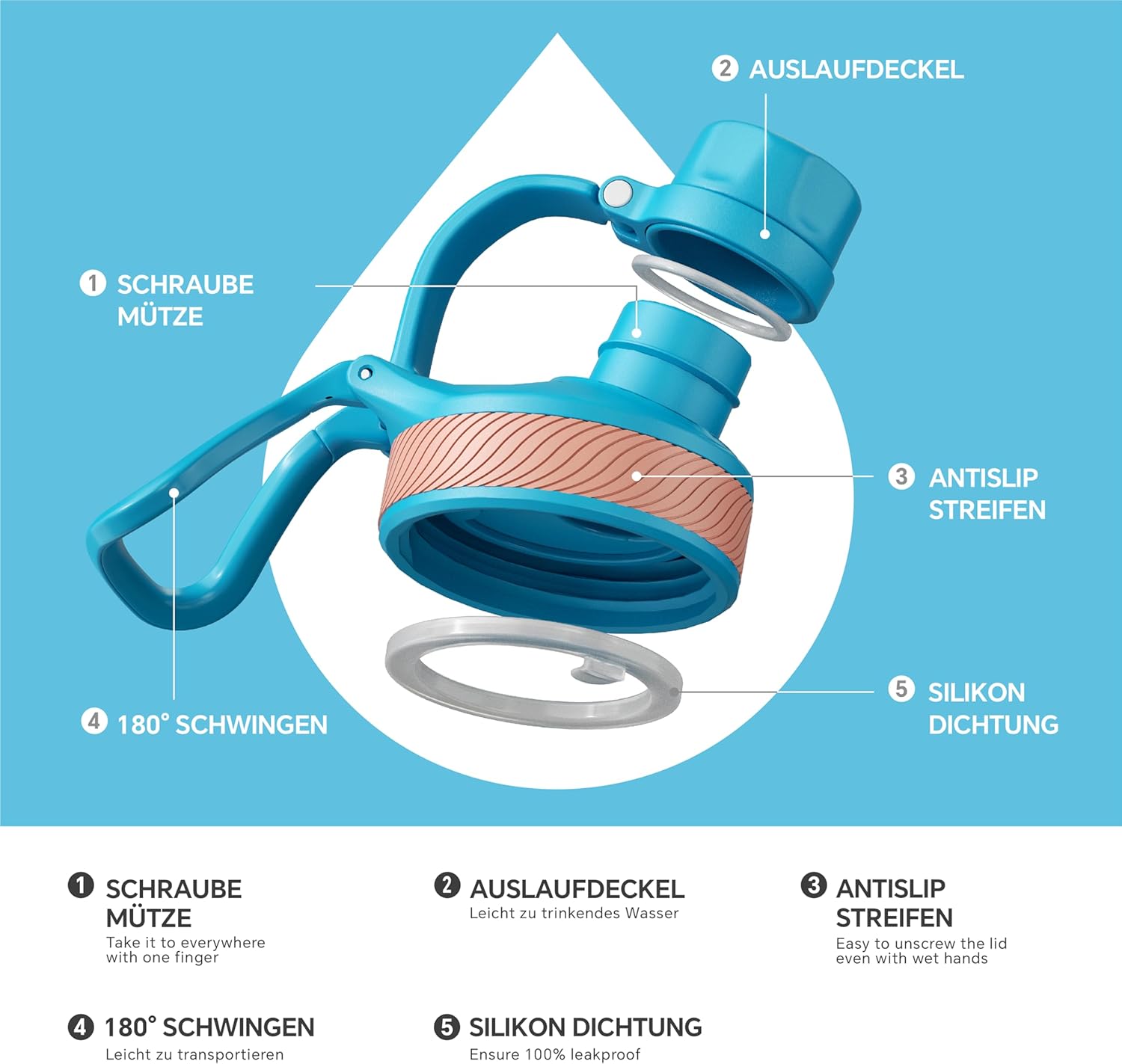 IDEUS Insulated Stainless Steel Water Bottle with 2 Leak-Proof Lids, Thermal Water Flask for Hiking Biking, 40oz, Blue Atoll