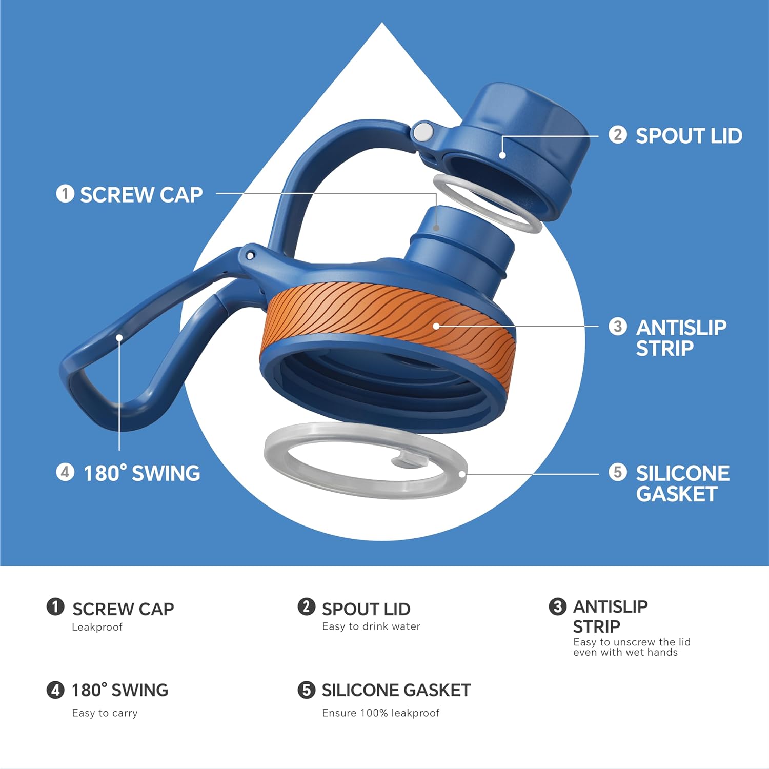 IDEUS Insulated Stainless Steel Water Bottle with 2 Leak-Proof Lids, Thermal Water Flask for Hiking Biking, 18oz, Bright Blue
