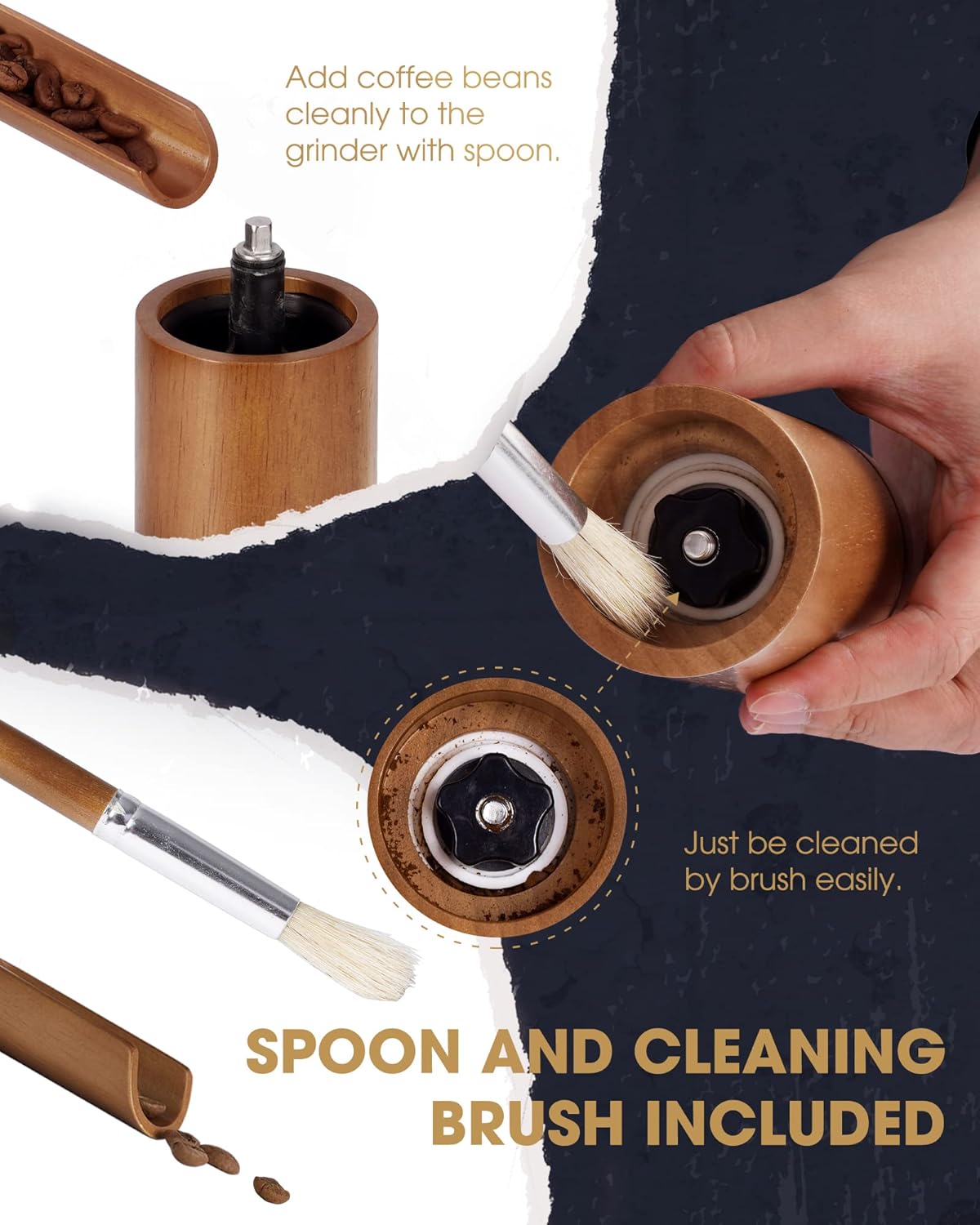 - Portable and Easy to Clean: Because of protable size and the detachable handle, Poliviar coffee grinder can be easily stored in your backpack. Cleaning brush and coffee bean spoon come with the coffee grinder,taking the cleaning process easily and helping you enjoy grinding anywhere without further tools.
