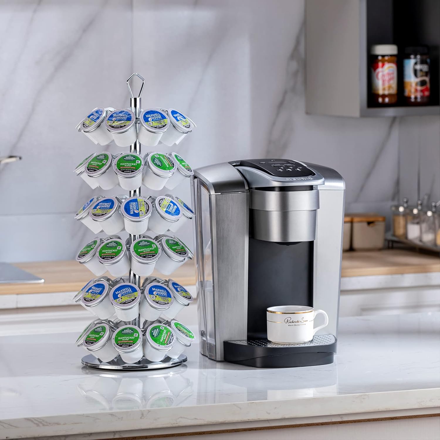 - 【Perfect for organization】The whole K cup carousel is made of metal and covered,with chrome finish.With 360 degree rotation feature, you could get K pod which in each angle.