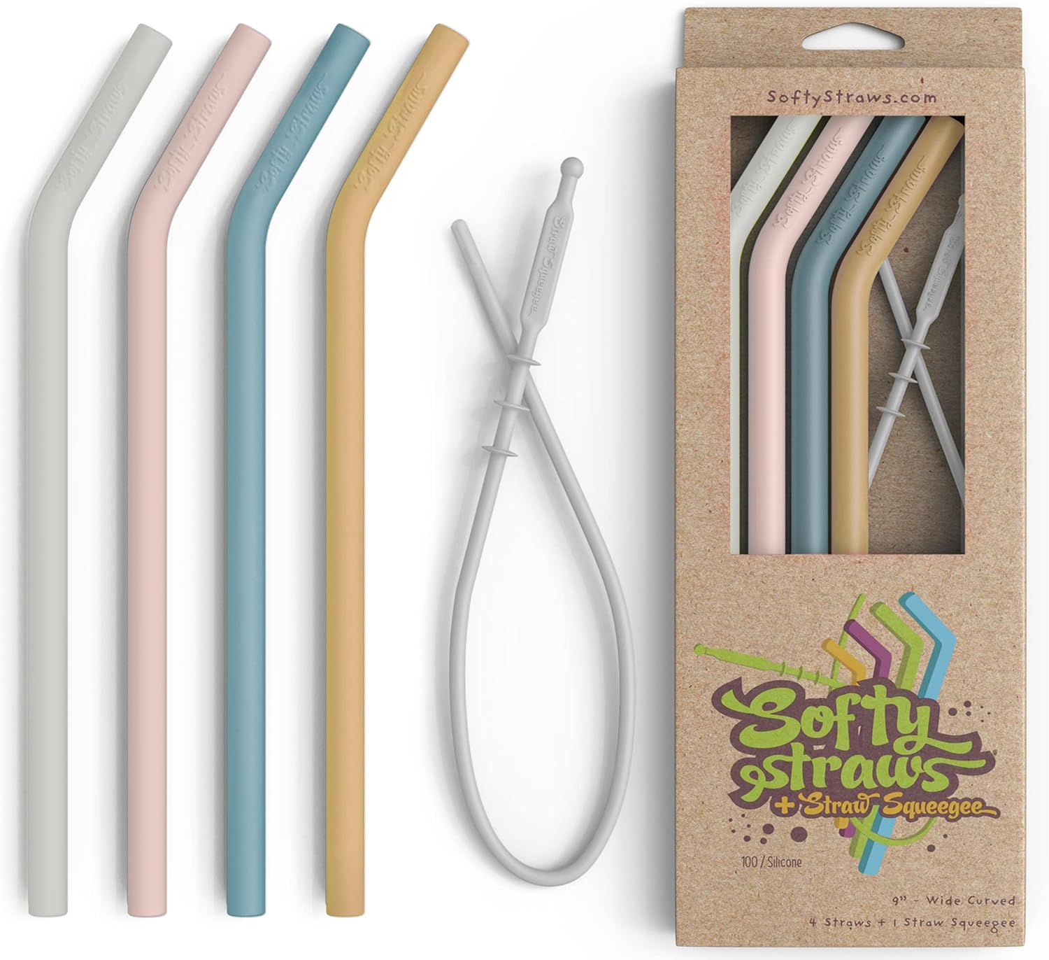 Premium Reusable Silicone Drinking Straws + Patented Straw Squeegee - 9” Long With Curved Bend for 20/30/32oz Tumblers - Neutral Pastel Colors, BPA Free, Flexible, Bendy
