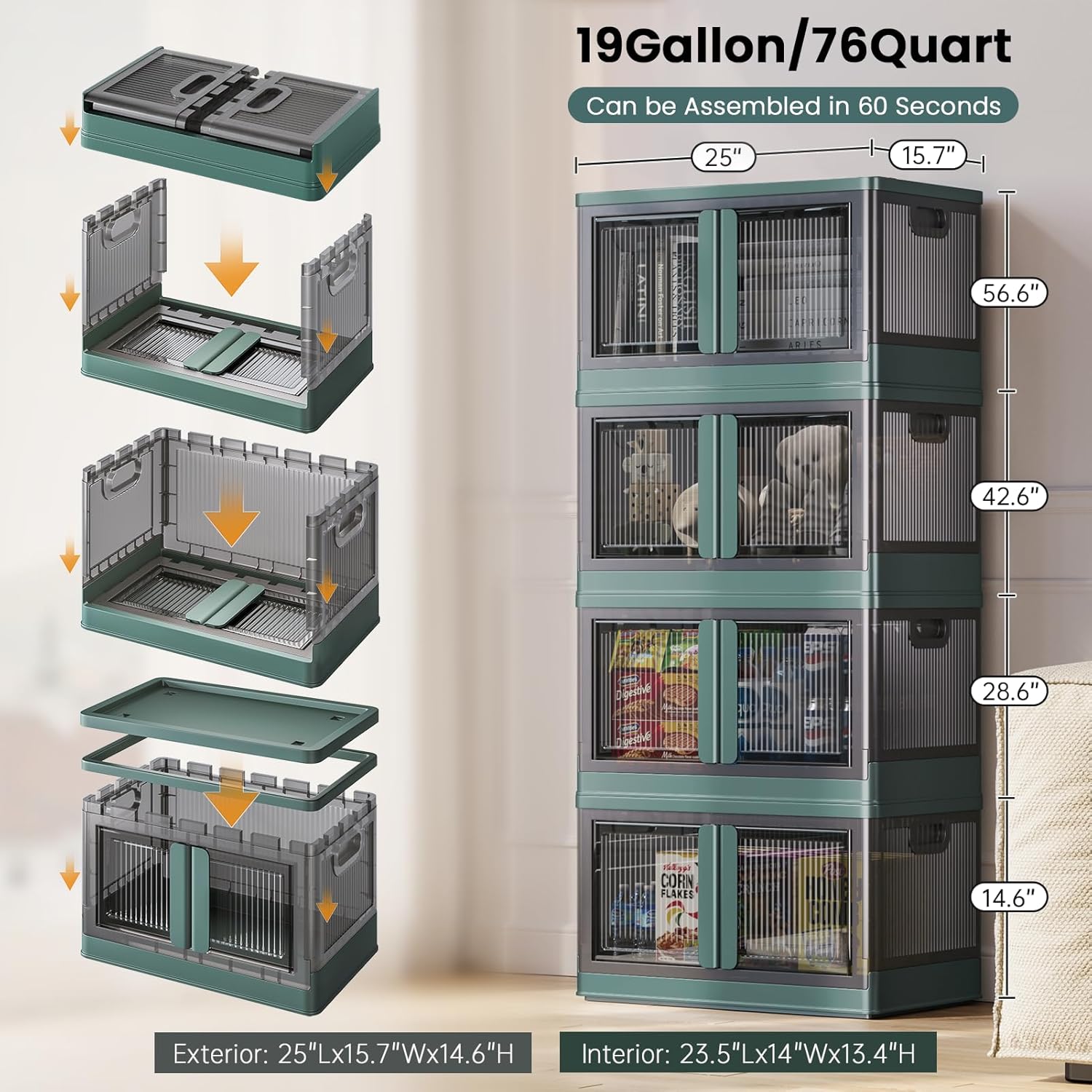 19Gal Collapsible Storage Bins with Lids & Wheels - 1 Pack Stackable with Doors, Heavy-Duty Plastic Containers for Home/Office, Green