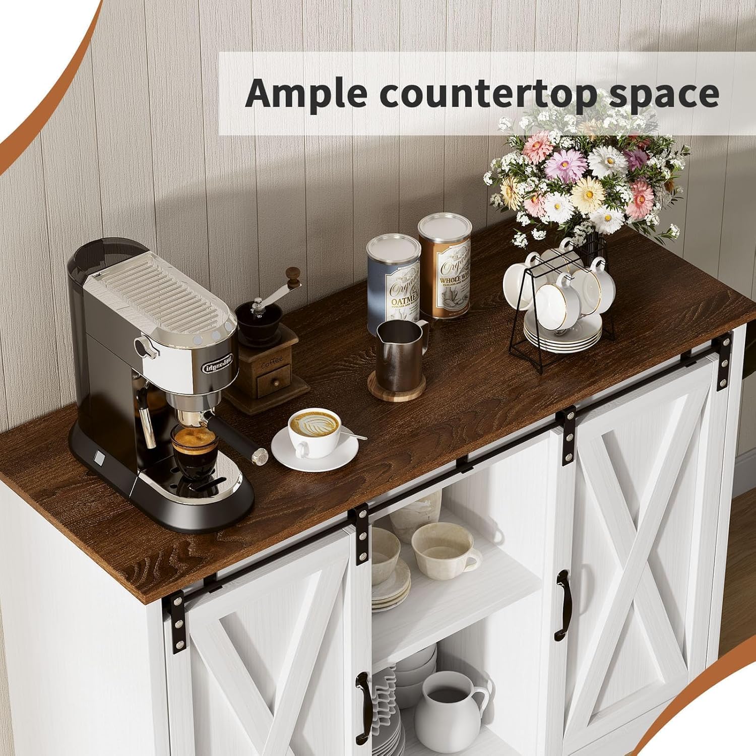 - CHOICE FOR LOVERS OF FARMHOUSE STYLE: Storage cabinet has 2 sliding barn doors with black metal fittings. Charming white coffee bar will fit in well with any home style, giving you a charming rustic feeling