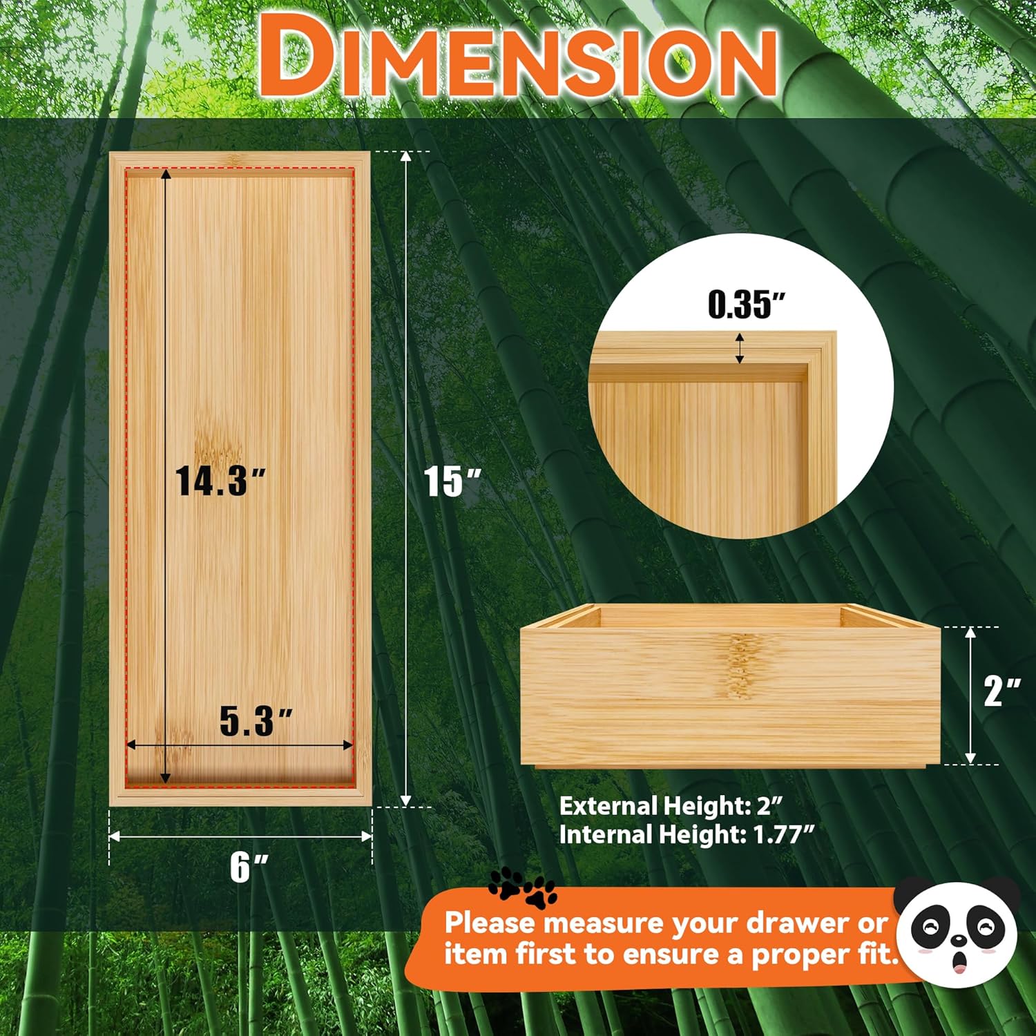 - Each bamboo drawer organizer measures: external size: 15" L x 6" W x 2" H; internal size: 14.3" L x 5.3" W x 1.77" H. Please check the size before purchasing