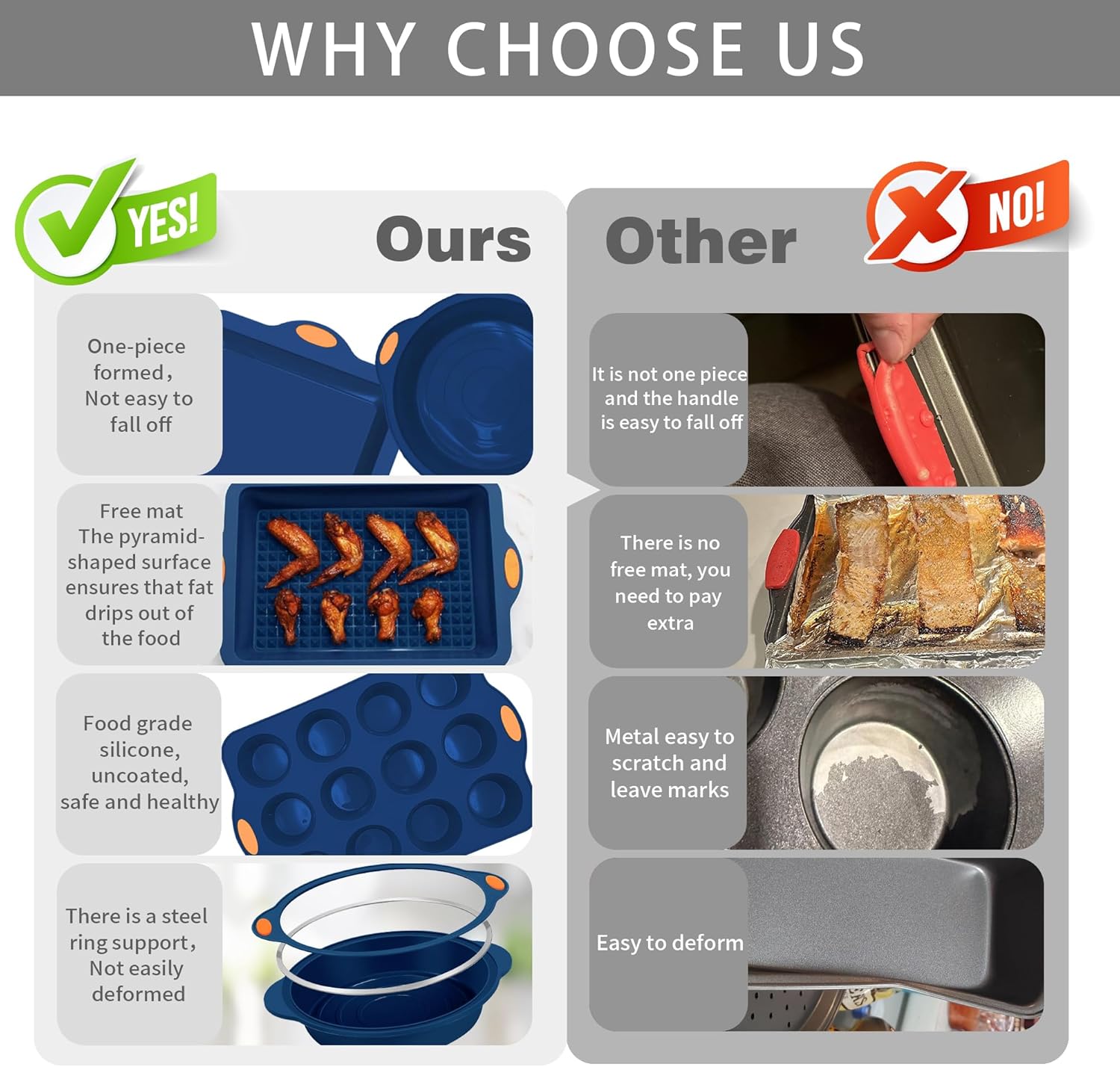 - More Strength - Metal structure around the edges of the pans make it strength and easier to put in and take out of the oven. Strong enough than usual silicone molds, no need to use baking sheet.