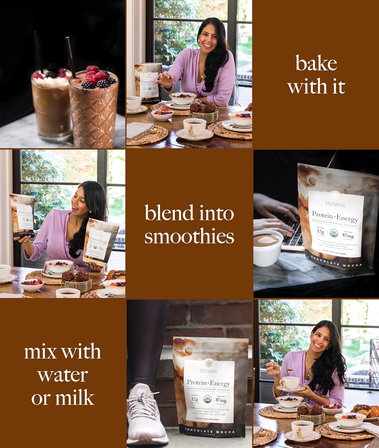 Truvani Protein + Energy Drink Mix with 87mg Caffeine | Chocolate Mocha | 12g Organic Plant Based Protein | 20 Servings | USDA Organic Coffee Powder & Adaptogens | Gluten & Dairy Free | Vegan