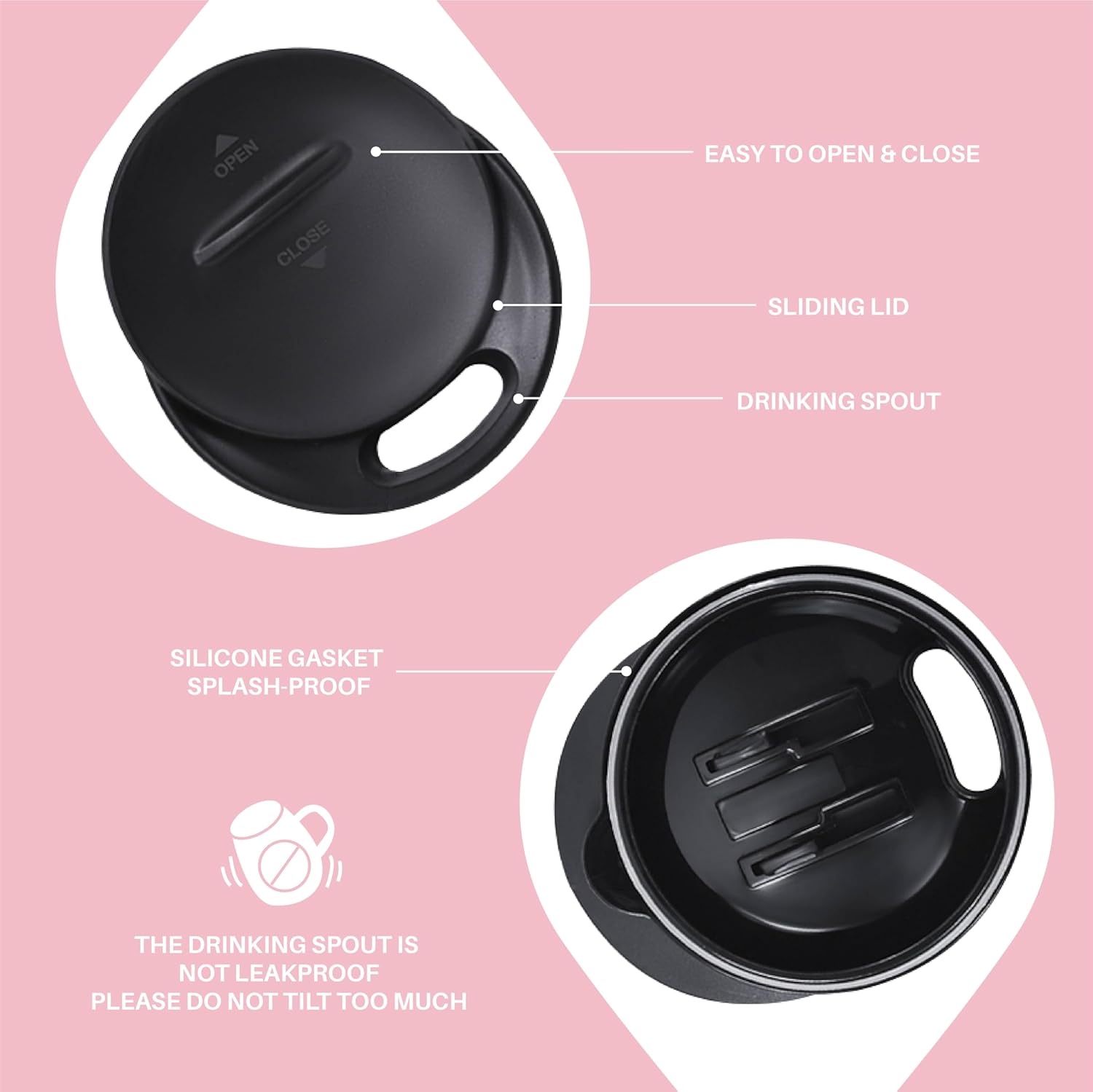 - 【PRESS-IN LID】 - Silica gasket seals to achieve maximum spillproof capability. Drinking hole on the top, with a splash-proof sliding cover. Please note it is to keep drinks contained and prevent heat/cold from escaping. It is not leakproof.