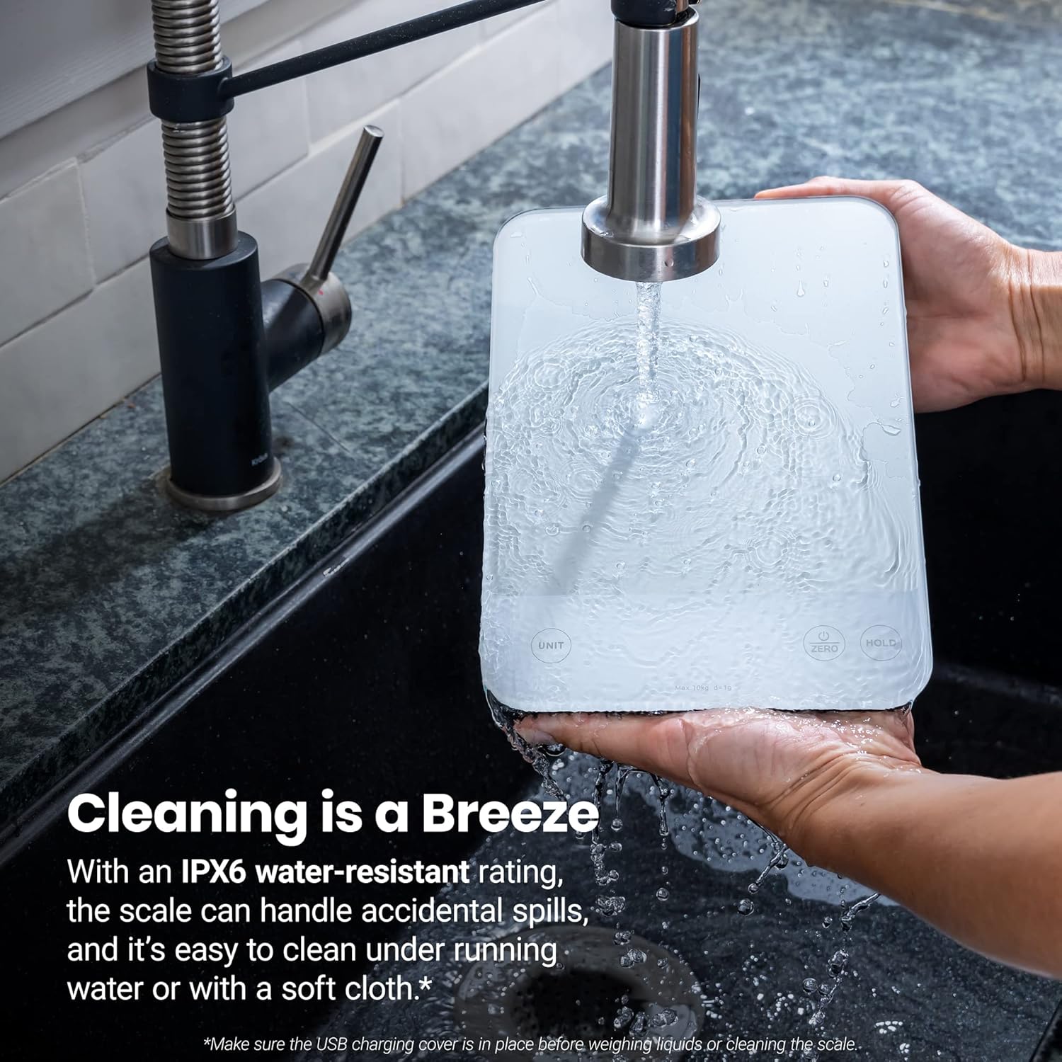 - 𝗪𝗮𝘁𝗲𝗿-𝗥𝗲𝘀𝗶𝘀𝘁𝗮𝗻𝘁 𝗗𝗲𝘀𝗶𝗴𝗻: The scale features an IPX6 water-resistant design, allowing you to easily measure liquids and wipe the scale clean
