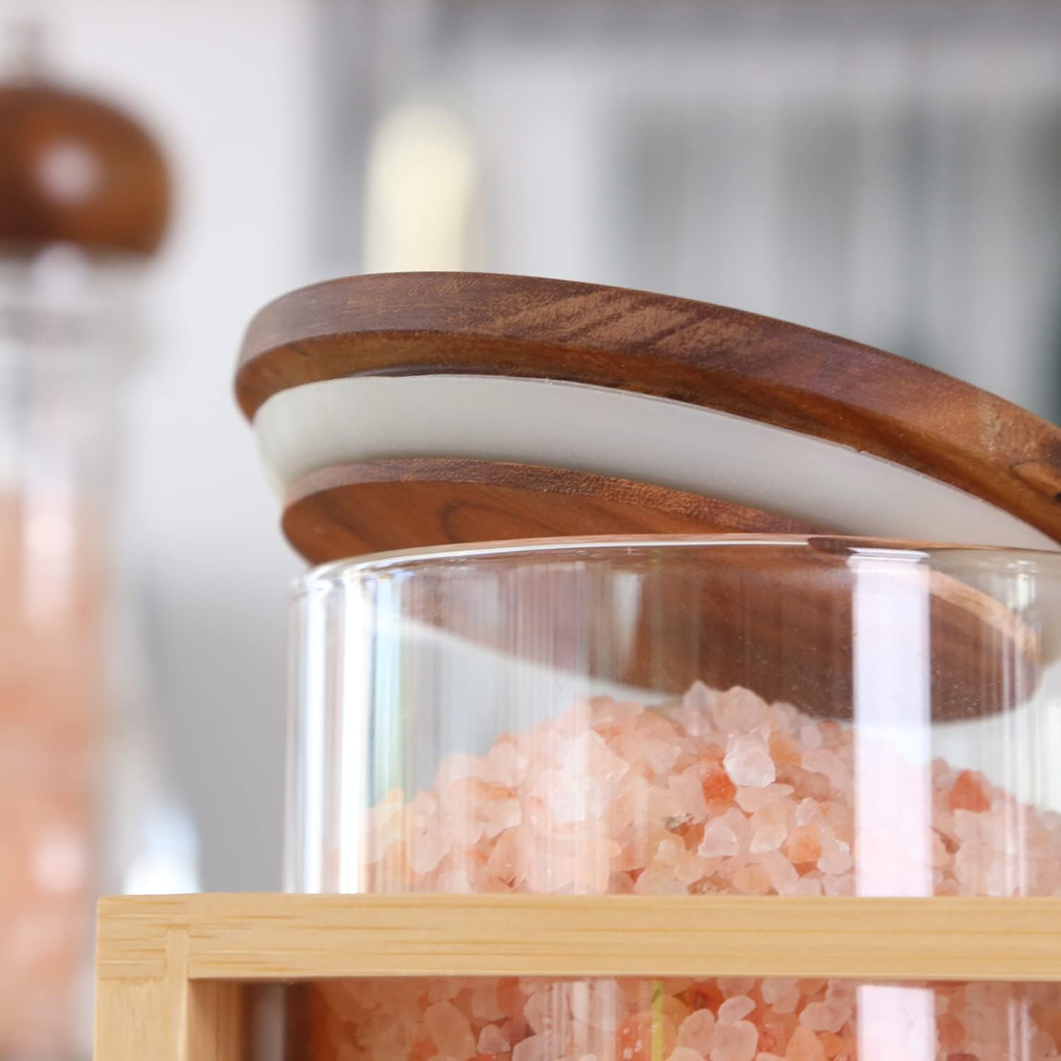 - Complete Set Includes:2 glass sealed jars (Height 3.77'' x Diameter 3.74'',Capacity:18fl oz/550ml),1 wooden handle scoop(1 TBSP) and 1 bamboo rack(10.24'' x 4.5'' x 2.76'' ,L x W x H).
