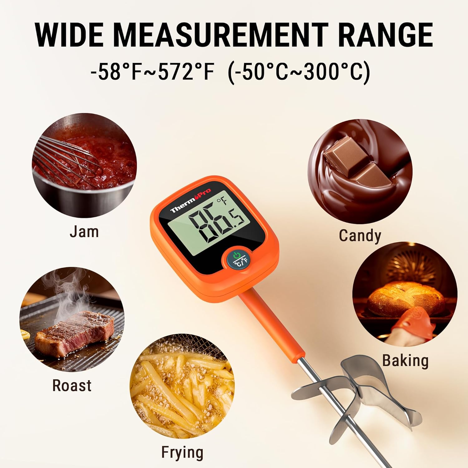 - 【IPX5 Waterproof】Compared with the traditional sugar thermometer with complex structure and sharp edges, this cooking thermometer can be easily cleaned under running water with IPX5 waterproof design