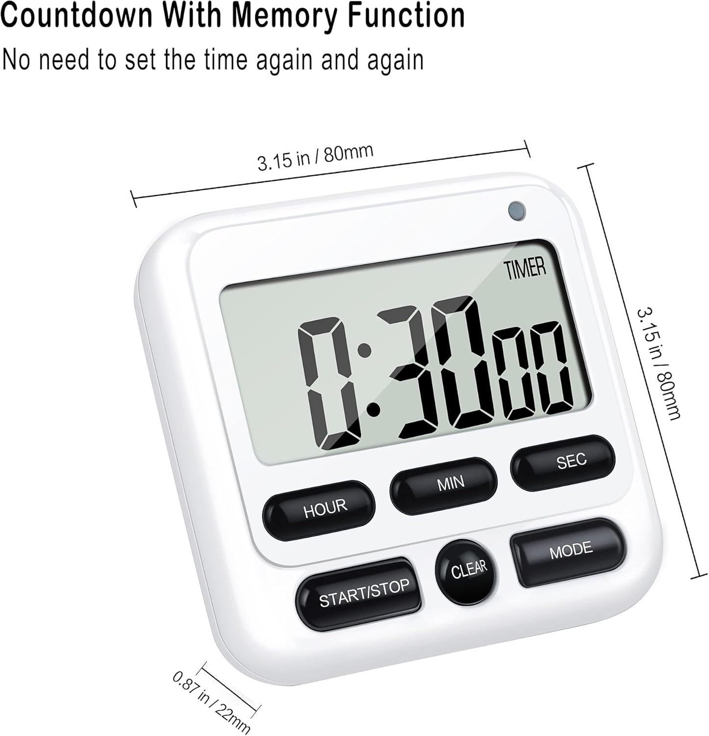 KTKUDY Digital Kitchen Timer with Mute/Loud Alarm Switch ON/Off Switch, 24 Hour Clock & Alarm, Memory Function Count Up & Count Down for Kids Teachers Cooking, Large LCD Display, Strong Magnet (White)
