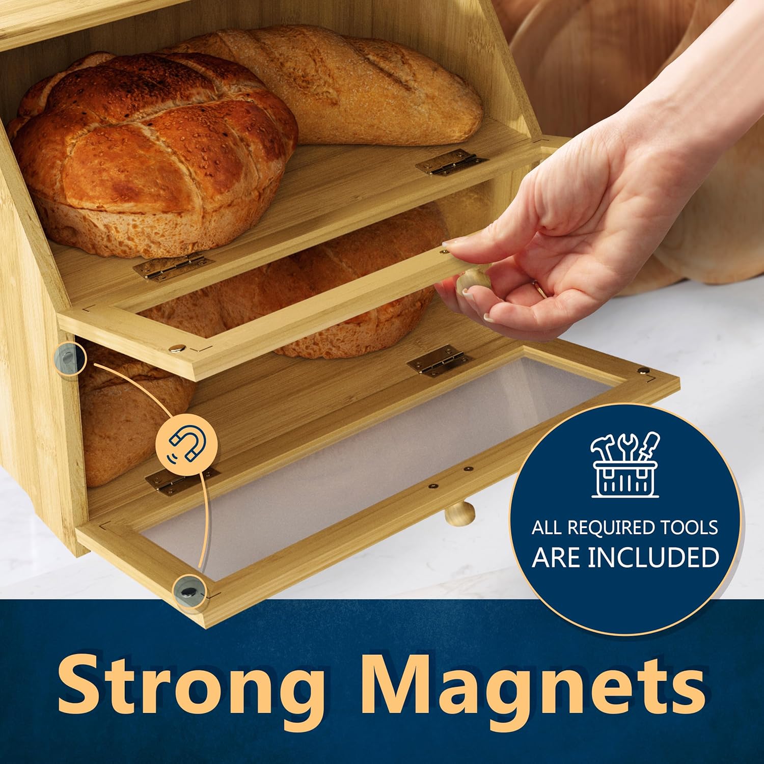 - Sturdy and stylish It’s a good choice to store your bread and baked goods inside this kitchen bread keeper. Made of 100% Bamboo, thicker and stronger than any other available