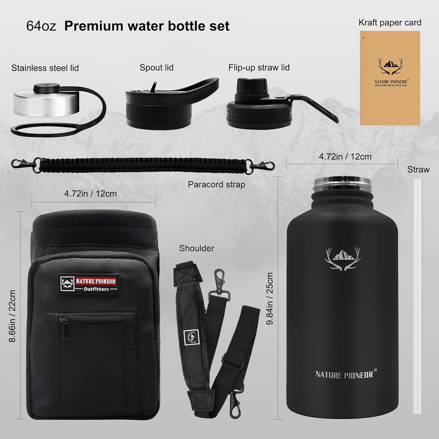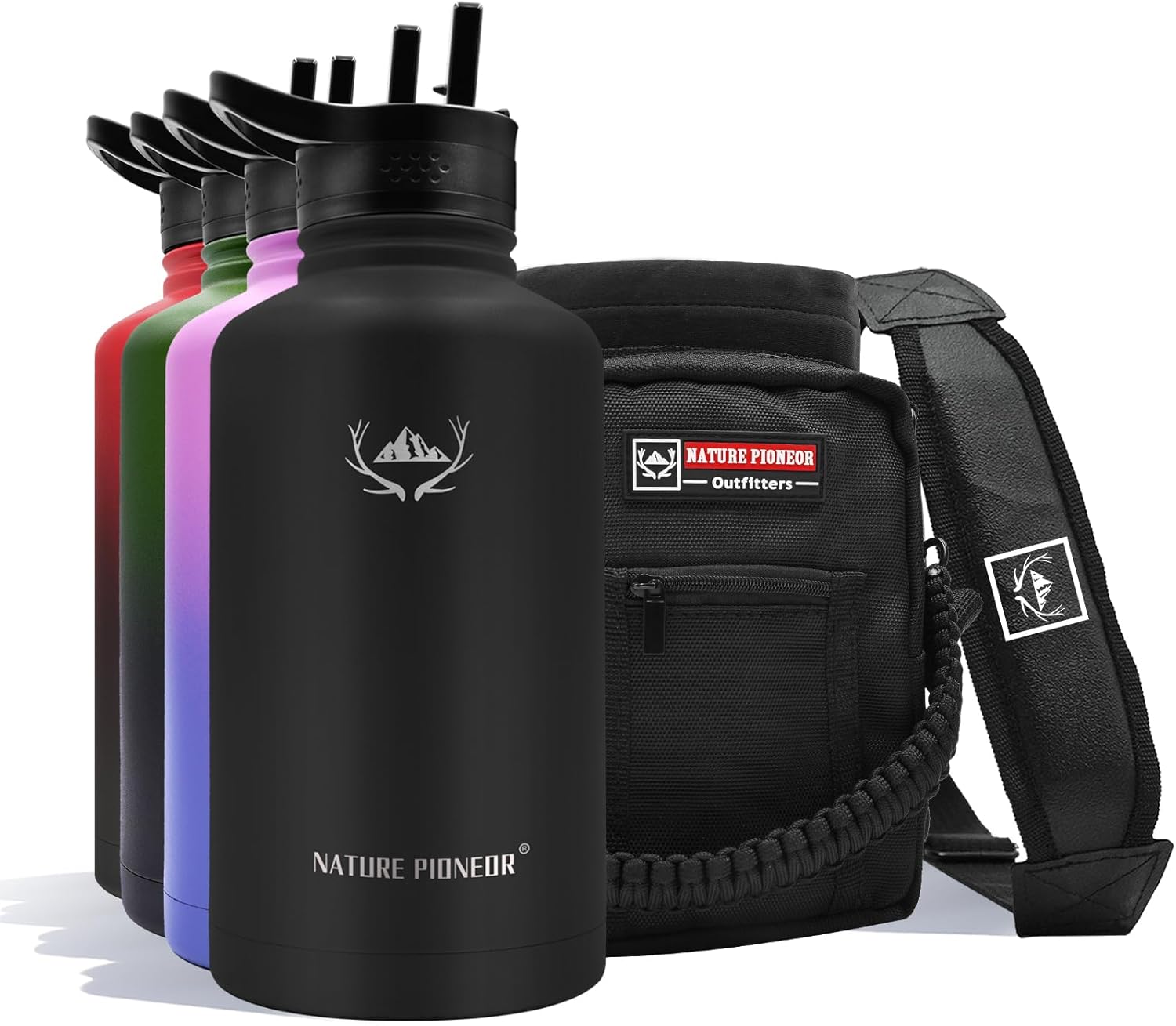 NATURE PIONEOR Insulated Water Bottles with Straw - 64oz Stainless Steel Vacuum Bottle with Holder/Carrier/Sleeve - Reusable 18/8 Food Grade Half Gallon Water Jug
