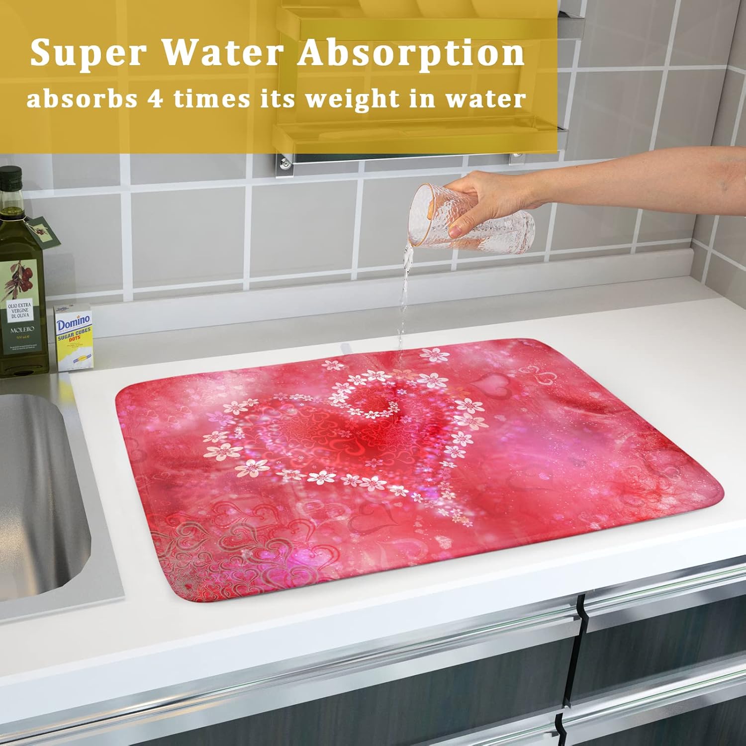Valentines Day Dish Drying Mat for Kitchen Counter Red Heart Flower Decor Drying Mat 18 x 24 Inch with Absorbent Reversible Microfiber Dish Drying Pad Dish Rack Drainer Mat for Coffee Bar