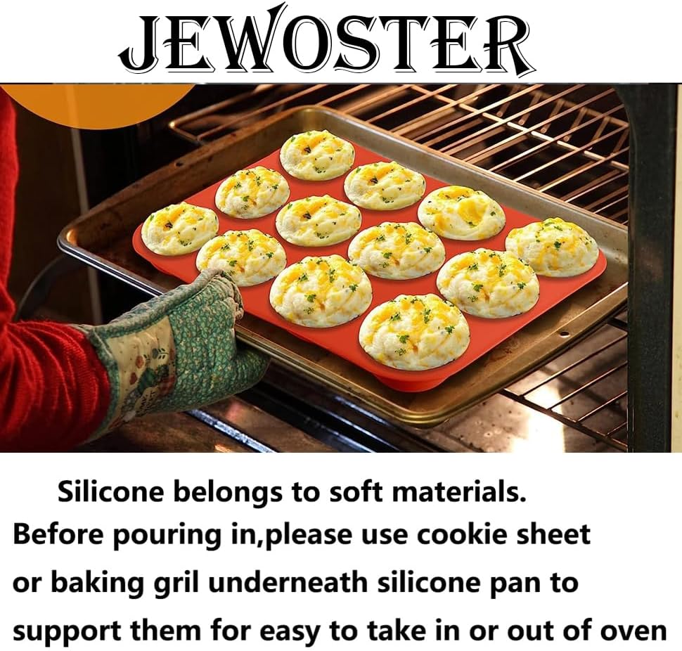 - FOOD GRADE SILICONE - (Silicone material is relatively soft.Before pouring in,please use cookie sheet or baking gril underneath silicone pan to support them for easy to take in or out of oven.For better demoulding result, it is recommended to spray a little layer of butter first)The muffin pans nonstick 24 is made of food-grade silica gel. Unlike aluminum pans, Jewoster muffin pans do not require coating to stay non-sticky,we ensure you have a non-stick experience.The reusable muffin tray is durable.