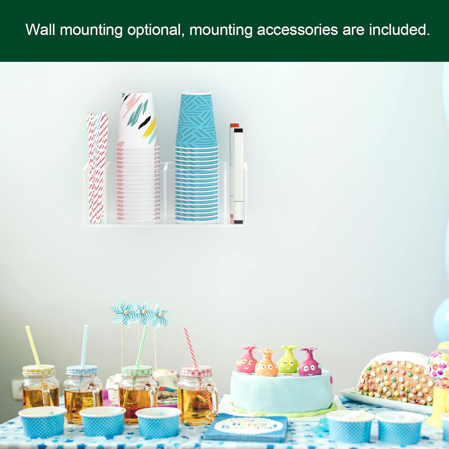 - Pre-drilled Holes on Back - with the wall-mounting brackets come with the package, you can also mount the disposable cup dispenser on wall in your bathroom, kitchen or office for everyday use. A space saver in house party, baby shower, birthday party, bachelorette party, wedding receiption to keep the drink cups clean and off the counter, makes a great hostess gift.