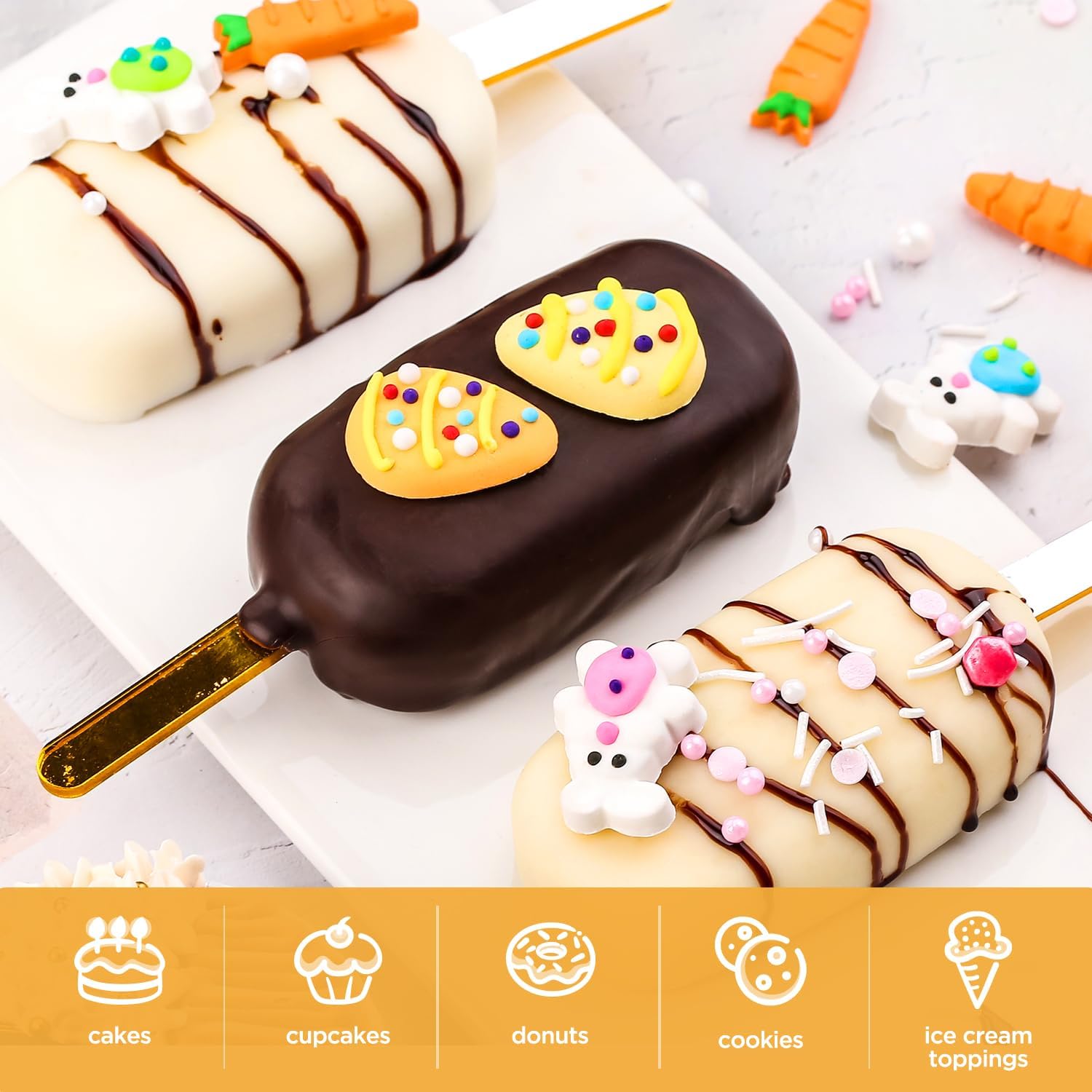 - Easy to Use: Put it on the baked goods, and kids could also easily complete the pastry decoration. You can place them directly onto your easter cake, carrot cake, cake pops, cupcakes, fondant cakes, brownies, ice cream, chocolates, and more