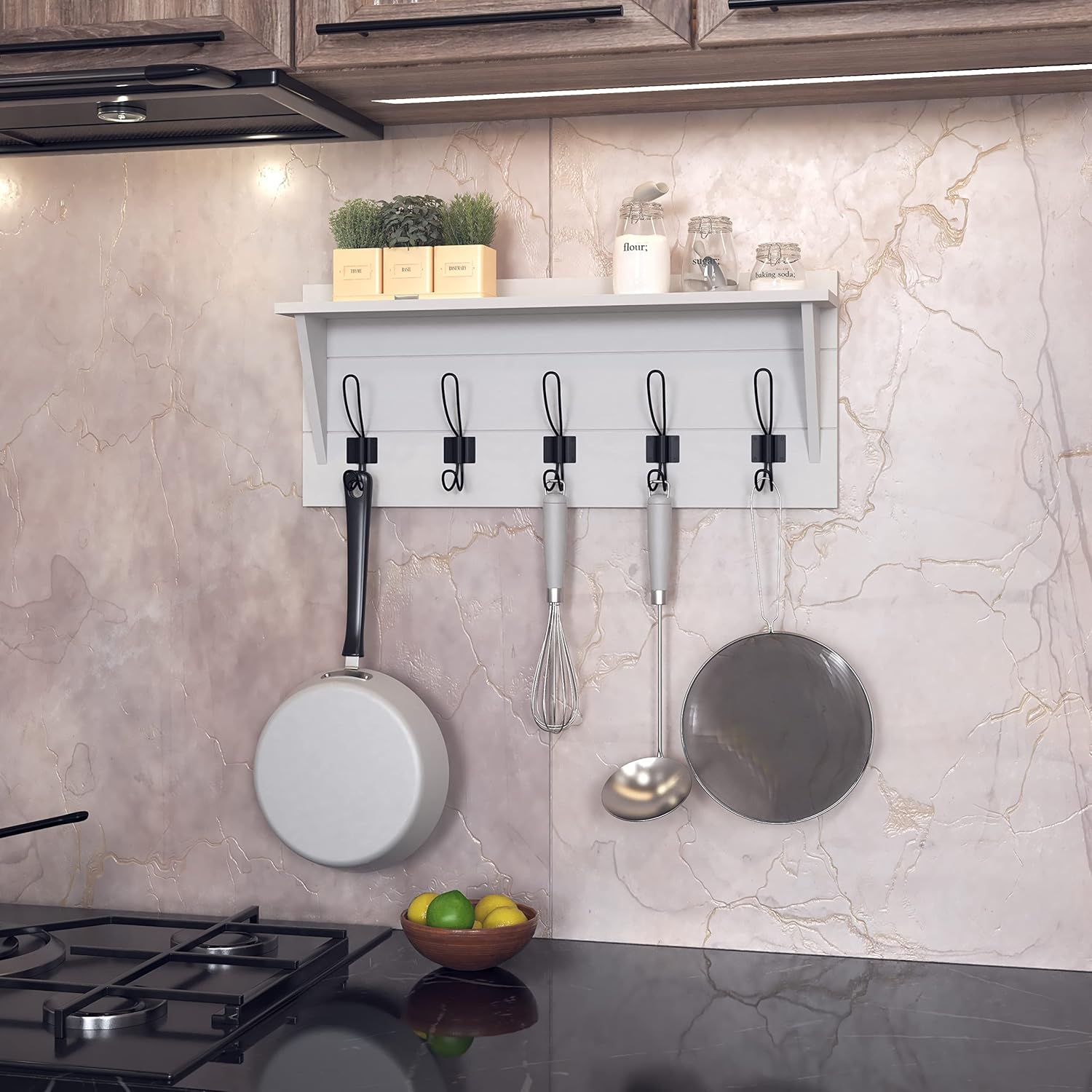 HBCY Creations 24" Wall Mounted Storage Rack - Pine Wood Construction - Solid White Finish - Upper Storage Shelf - 5 Hooks - Ideal for Entryway, Kitchen, Bathroom