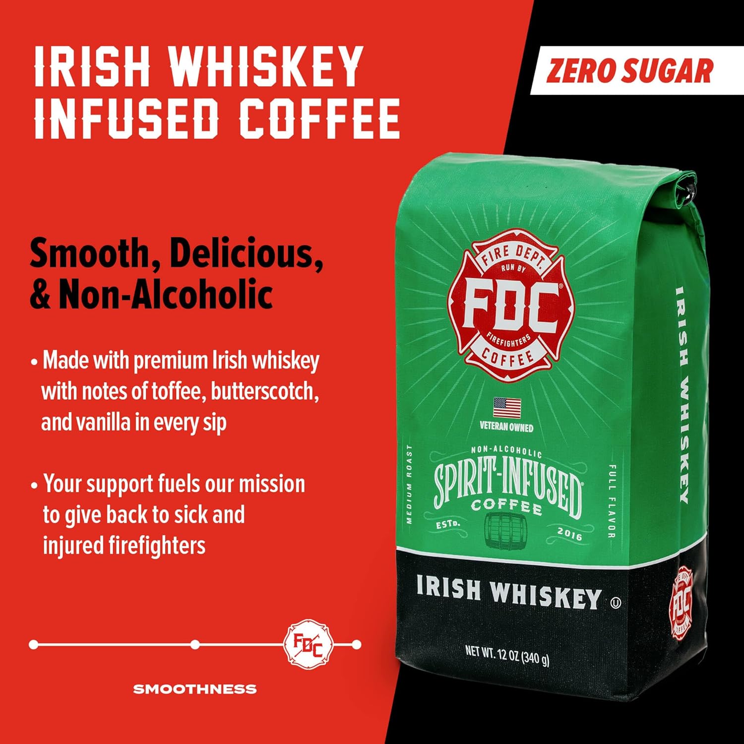 Fire Department Coffee - Gives Back to Firefighters - Irish Whiskey Infused Ground Coffee - Medium Roast - Non-Alcoholic - Roasted in the USA - Veteran Owned -12 oz