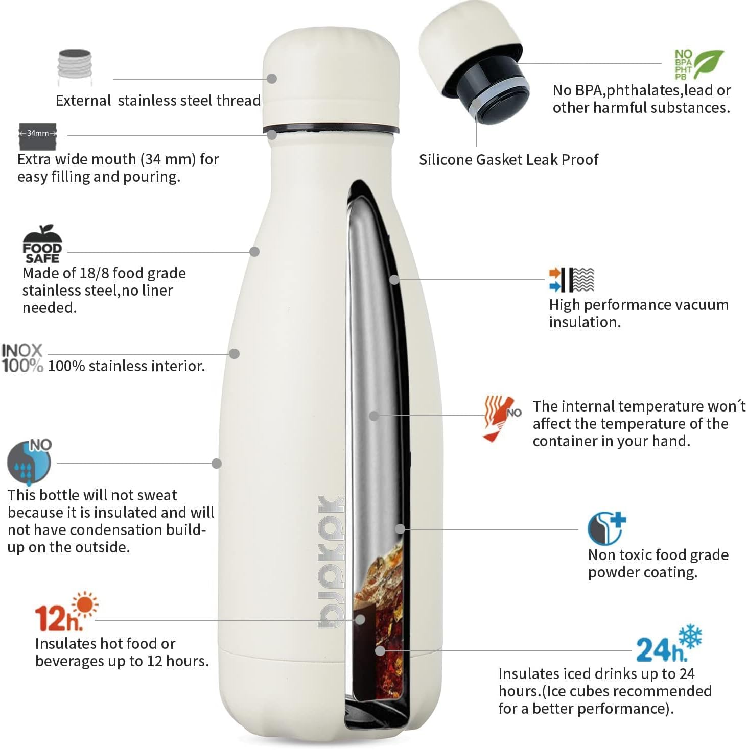 - Keep Drinks Cold & Hot: Adopt double wall vacuum insulation design, keep your drinks ice cold for 24 hours and hot for 12 hours within our highly performed insulated water bottle