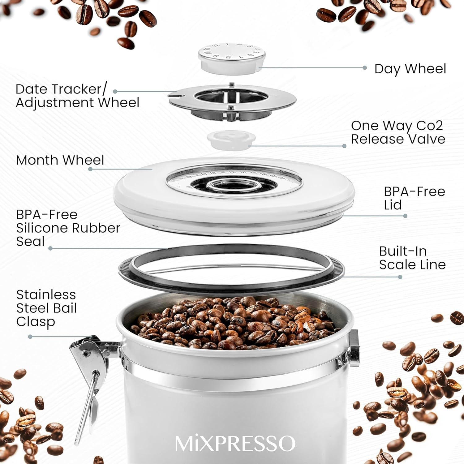 - Coffee Jar with Date Tracker: This white coffee bean storage includes a built-in day/month dial to monitor freshness. Great for ground coffee, tea leaves, and dry goods with ample space.