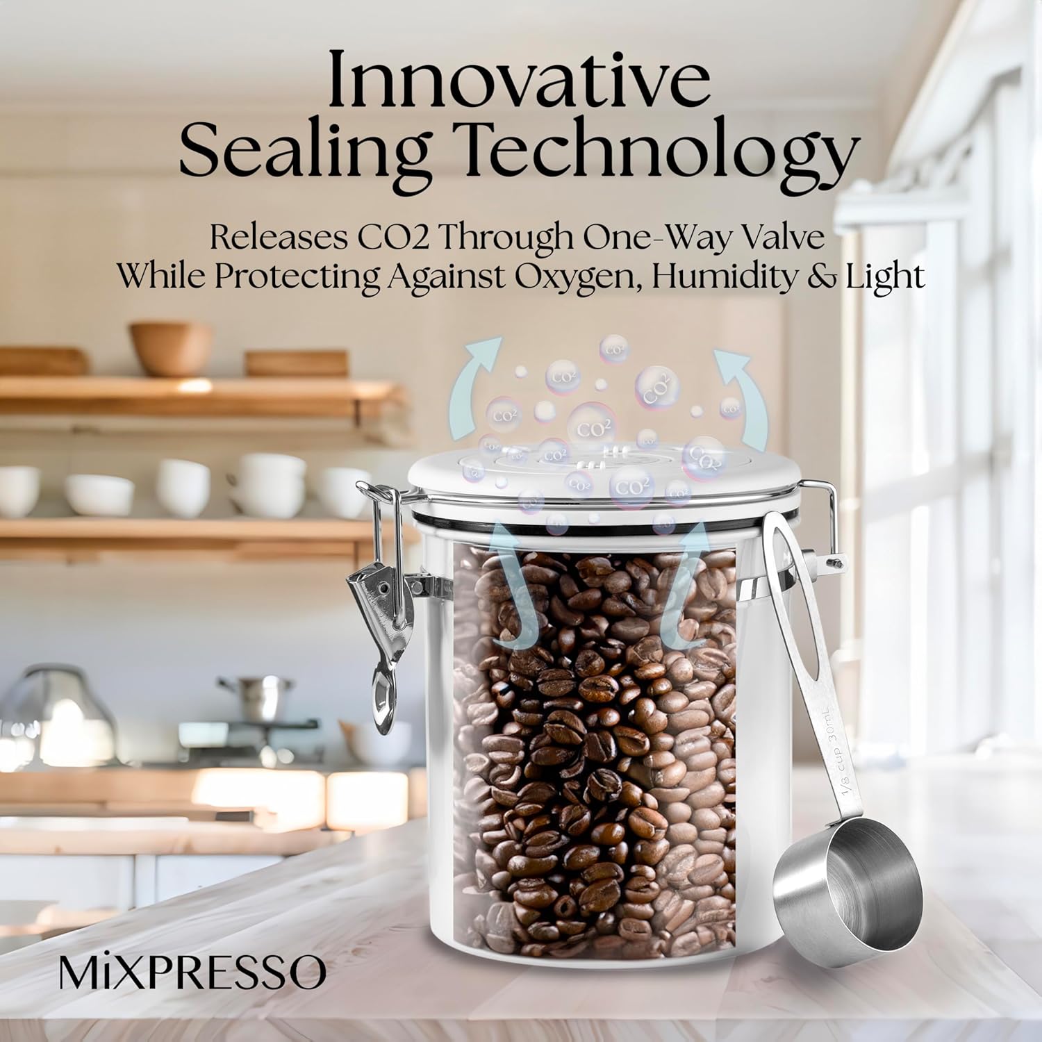 - Coffee Storage Container with Airtight Seal: White coffee container for ground coffee with clamp lid and CO2 valve keeps coffee beans, tea, sugar, and dry goods fresh by blocking air, light, and moisture.