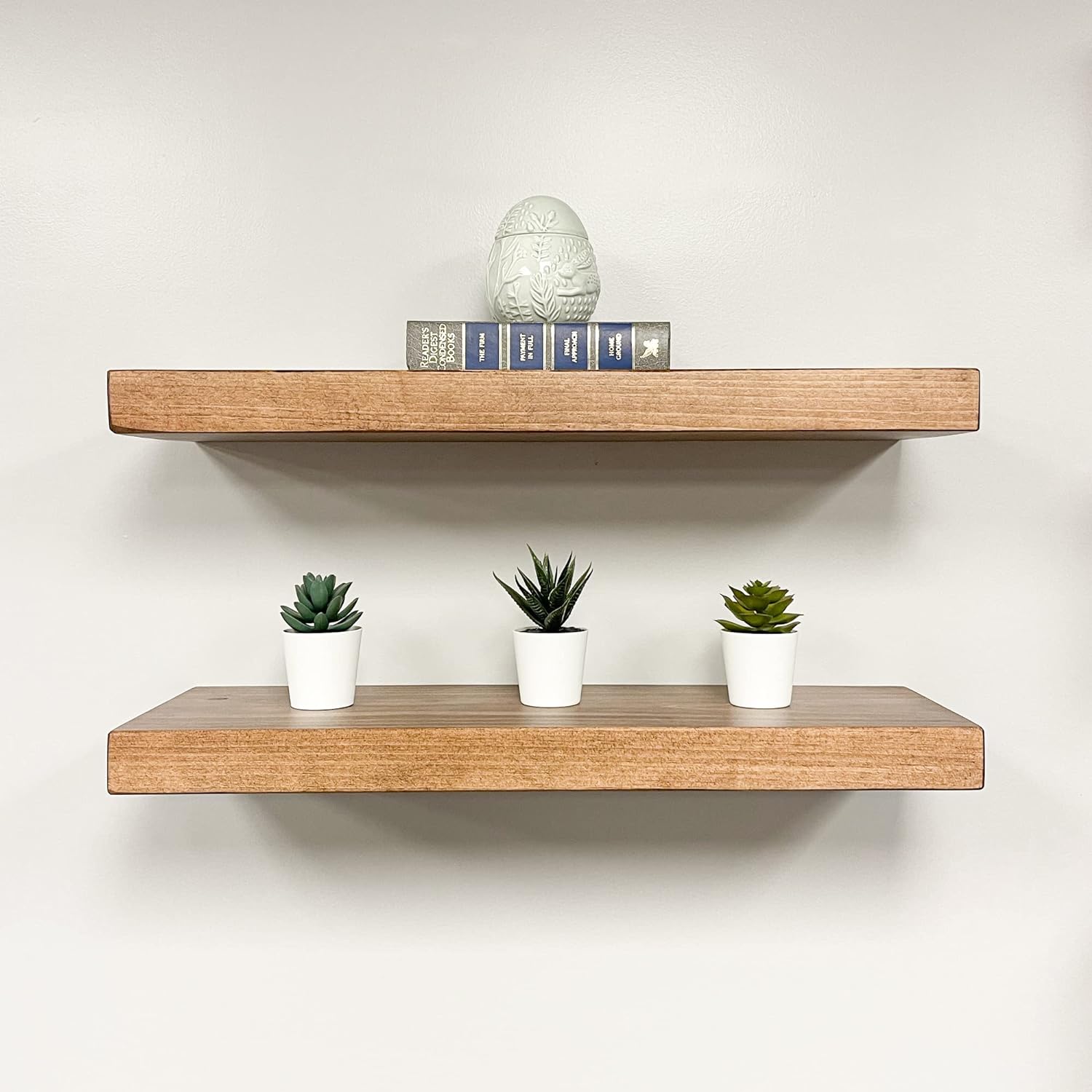 - HIGH QUALITY FLOATING SHELVES: each shelf is 1 3/4" thick handcrafted from solid pine in USA and made to last. Our shelves are protected with polyurethane and are ready to be used. Support up to 40 pounds of weight per stud (2 studs=80pounds). Easy to install.