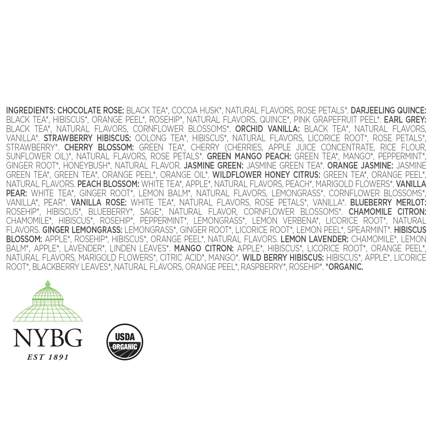 - LUXURY TEA BAG ASSORTMENT with 40 infusers in 20 blends. Favorite hot teas including Orchid Vanilla, Ginger Lemon, Cherry Blossom, Wildflower Honey Citrus, Peach Blossom, Vanilla Rose, and more.