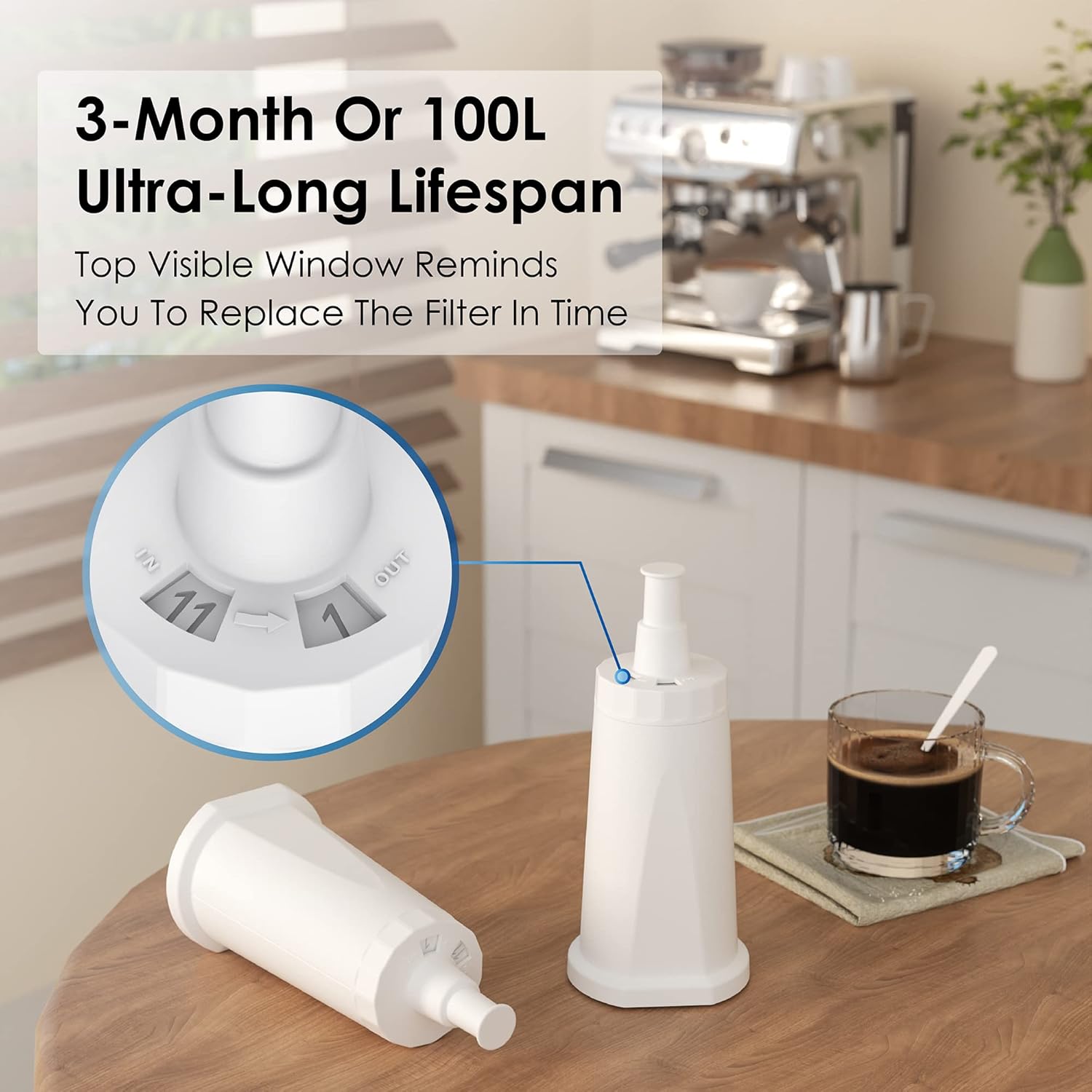 - 100L Filter Capacity & Easy Installation:Each filter has a capacity to filter 100L of water. It is easy to install, requiring no tools. Simply pre-soak the filter in water for 5-10 minutes to rinse and remove bubbles, then place it in your coffee machine's water tank. The monthly dial tracker ensures you always change filters on time.