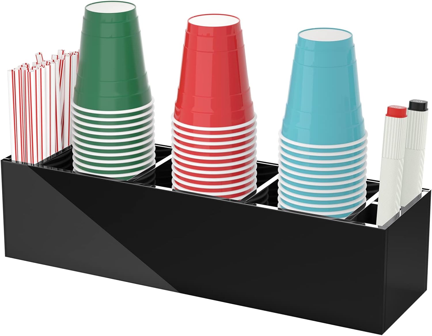 - Cup Holder with Marker Slots on Both Sides - more convenient, practical to help your family or friends save time mark their red cups and track it for refill, less waste in the gatherings, save household money! With the sided slots, you will have extra space to keep some straws, stirs, sugar packets in it when you are having a summer party, outdoor barbecue on the patio, camping trip at the lake. Can be used as a bar caddy too. Cute plastic cup holders for counter help you get rid of clutter.