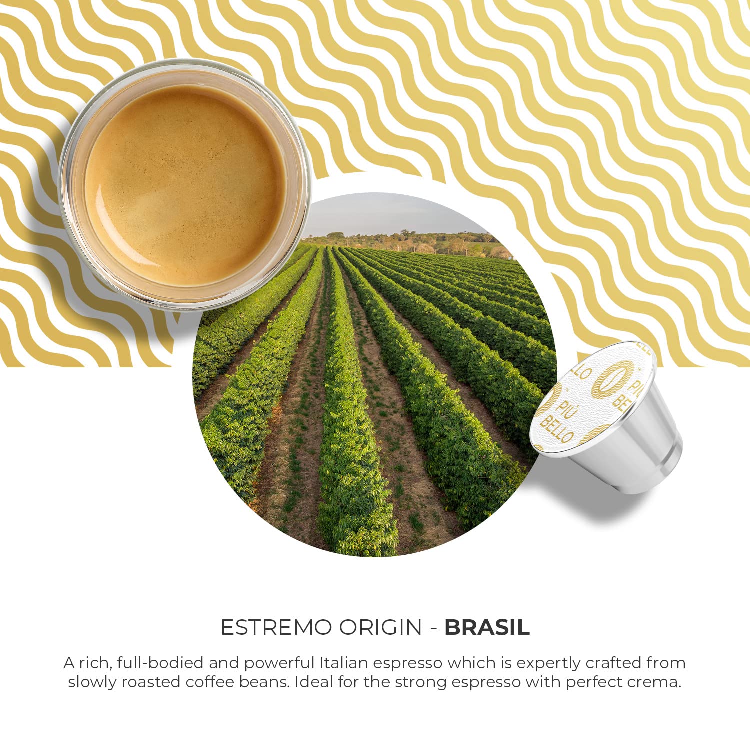 - ESPRESSO ESTREMO COFFEE - Choose Espresso Estremo flavor Nespresso pods for that classic dark Italian espresso flavor, expertly crafted from slowly roasted coffee beans. Ideal for making a strong espresso with perfect crema, e un cenno a Napoli (and a nod to Naples).