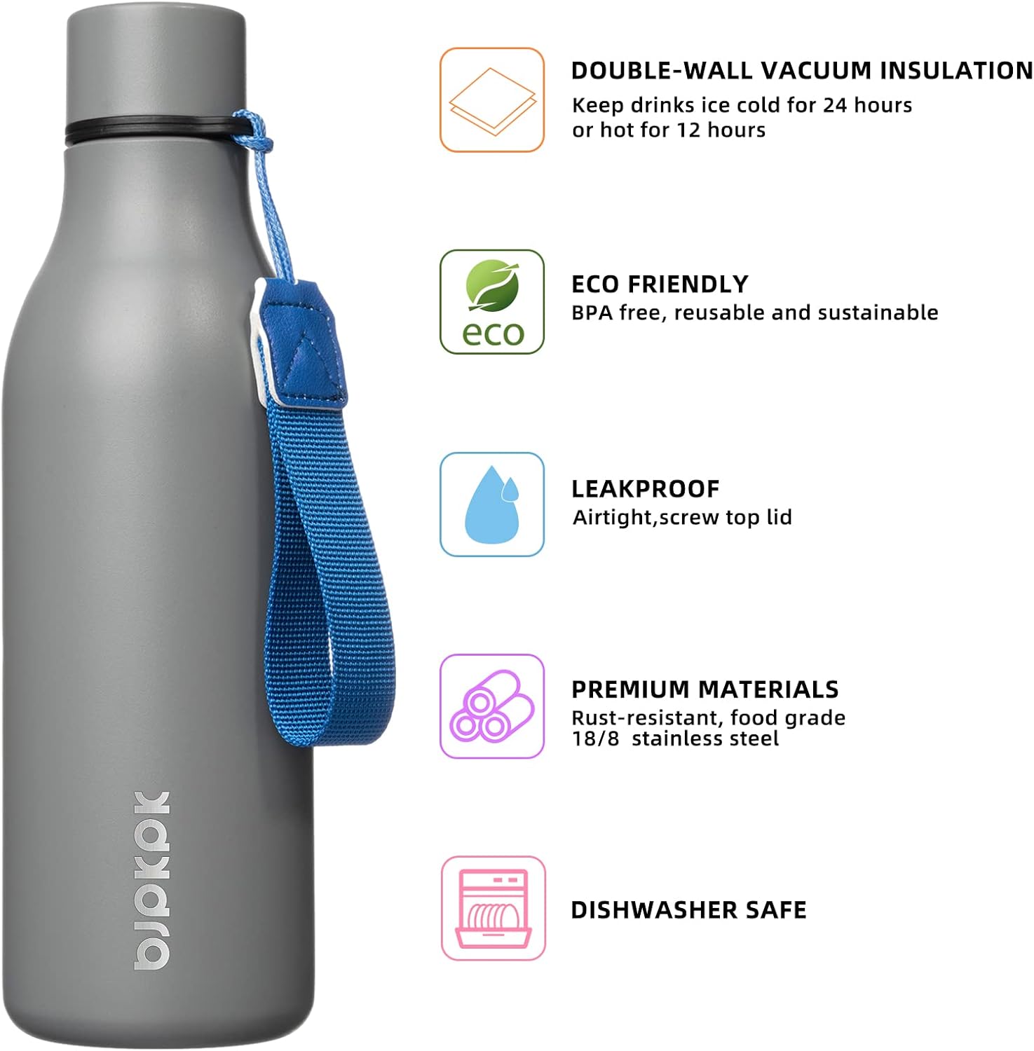 BJPKPK Insulated Water Bottles, 18 oz Stainless Steel Metal Water Bottle with Strap, BPA Free Leak Proof Thermos, Mugs, Flasks, Reusable Water Bottle for Sports & Travel, Grey