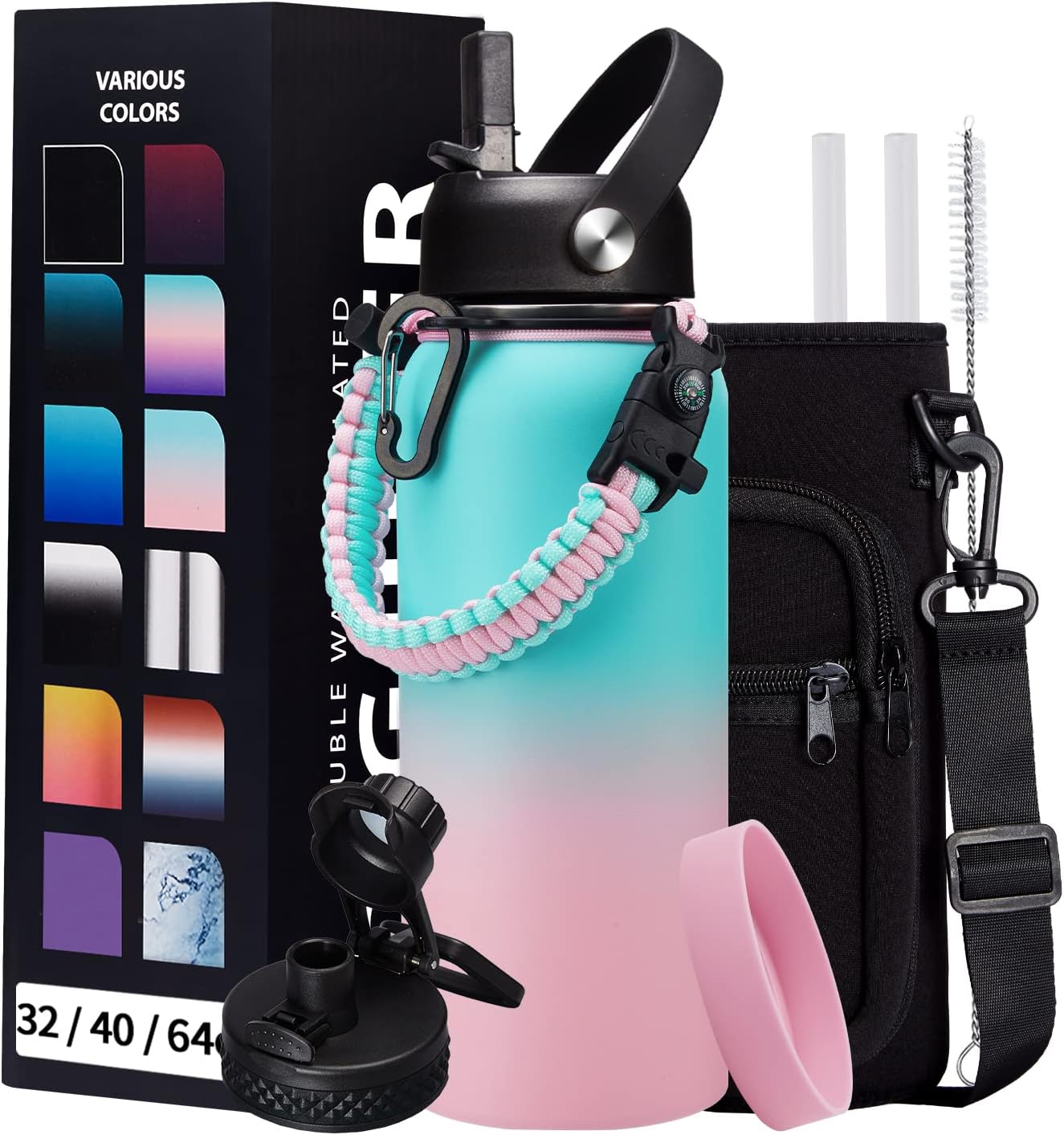 - SUPER JOYFUL COMBO: Buy 32oz insulated water bottles and get 9 accessories (2 x lids, 1 x survival paracord, 1 x carrying pouch, 1 x shoulder strap, 1 x protective cup mat, 2 x straws, 1 x straw brush). WITH A LIFETIME GUARANTEE, these thermal water bottles are perfect gifts for using at home, work, school, road trips, hiking, sporting events, or just hanging out