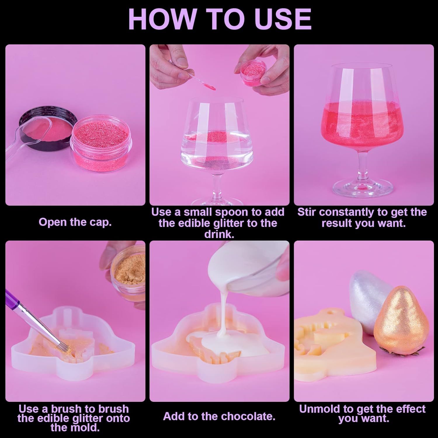 - Widely Used - This edible glitter is versatile and perfect for DIY wine, cocktails, champagne, drinks, beer, soda and more. It can also be used to decorate cakes, cookies, chocolates, macarons, fruit platters, cupcakes, strawberries, lollipops, ice cream and more. Add a gorgeous shine to your drinks or baking!