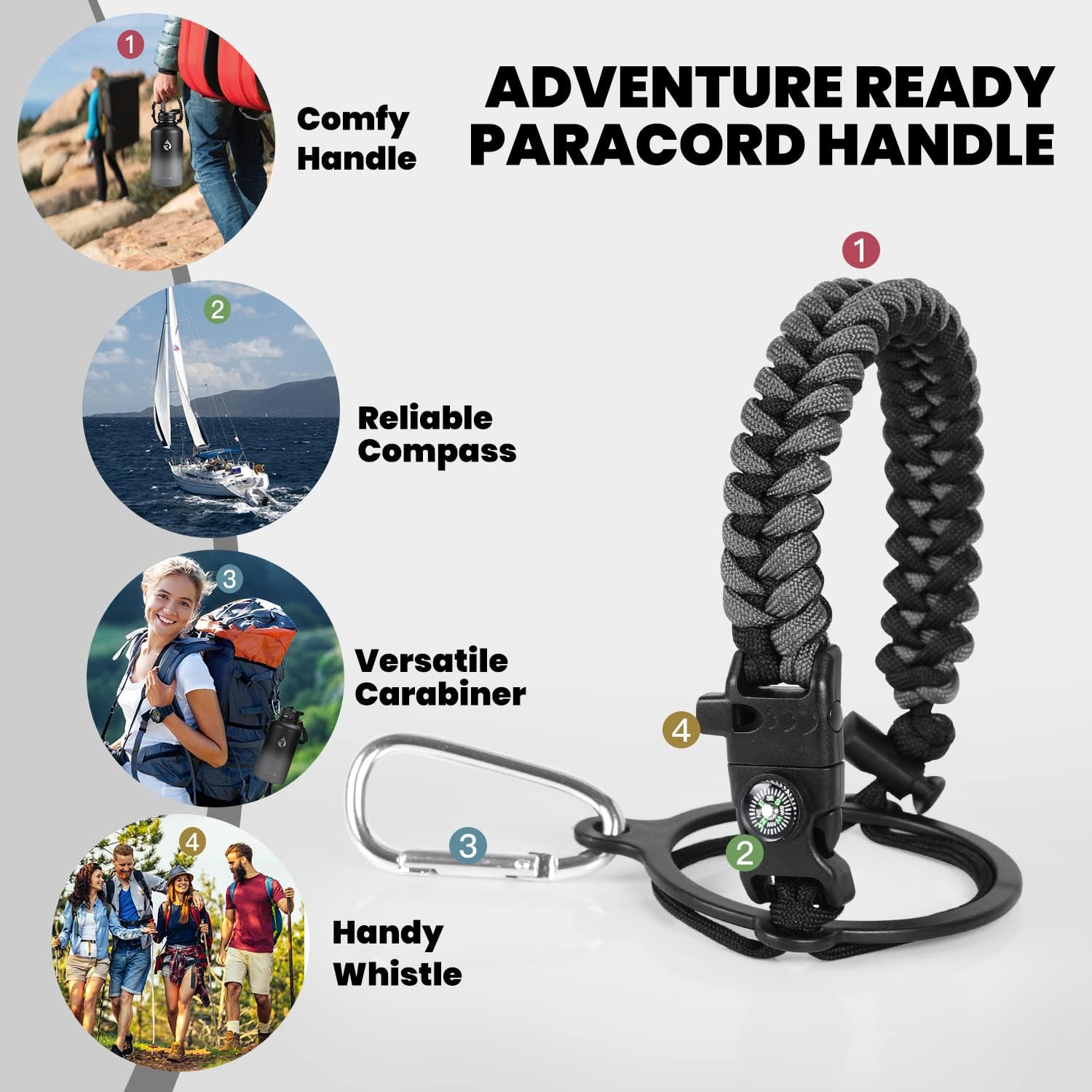 - Iconic Paracord Handle: This insulated water bottle comes with a beautiful hand knit nylon paracord in coordinated color with the water bottle. Configured with a compass and carabiner, this paracord handle is a must-have as a full functional camping / hiking flask