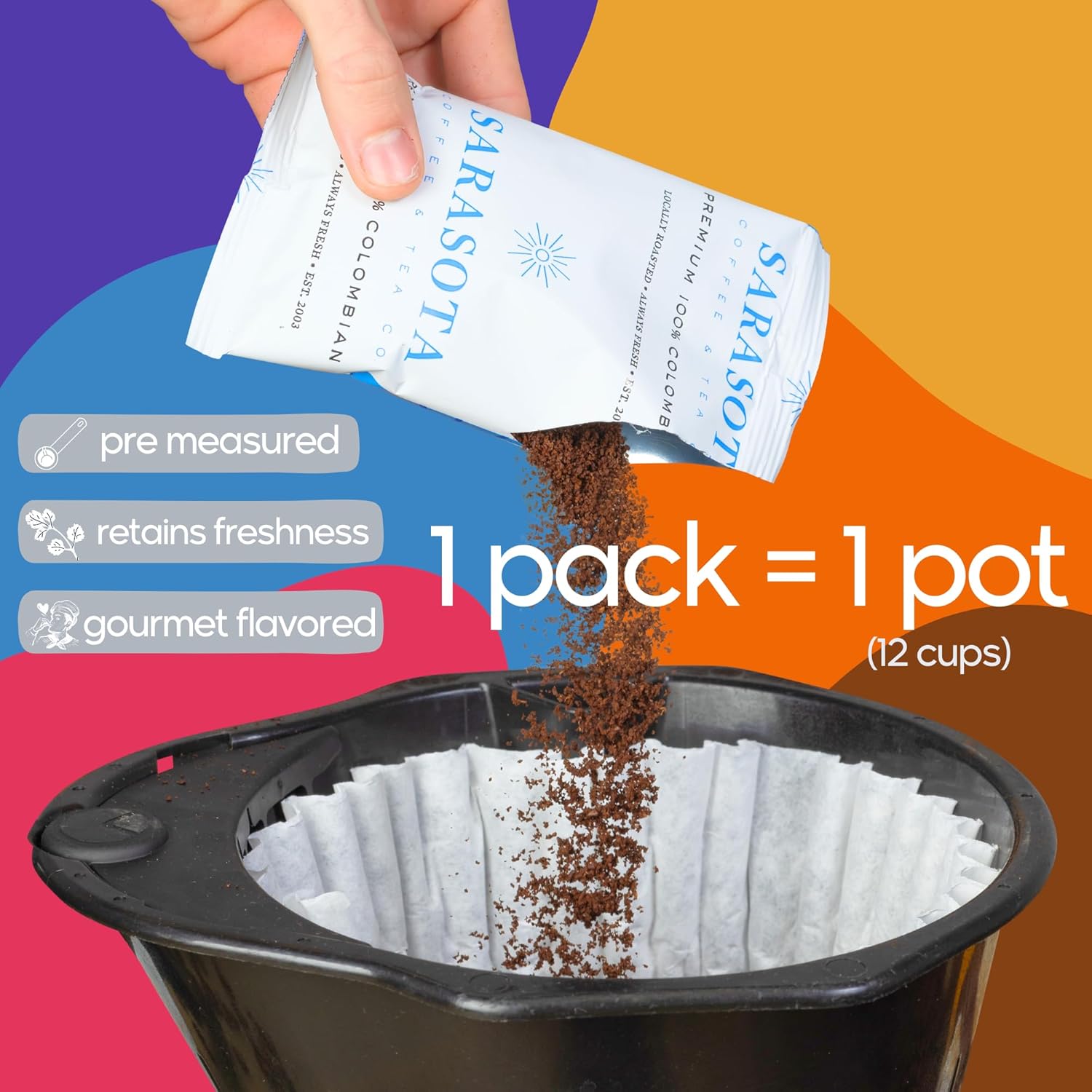 - PRE MEASURED CONVENIENCE - Each individual Packet is for a 10-12 Cup drip maker to make 1 full pot. The premeasured pouches keep your grinds fresh for over a year, ensuring each sip will be a silk smooth gourmet experience.