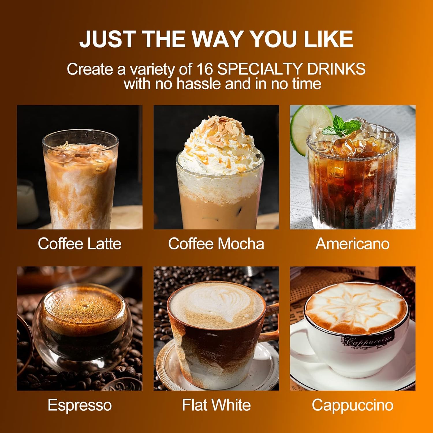 - ☕ Touch Screen: The touch screen display simplifies how to make your favorite coffee in 3 easy steps: Grind, Brew and Milk;16 kinds of coffee,each coffee all can adjust the water content, milk content, coffee concentration.Easily choose from Lattes, Cappuccinos, Americanos, Espressos, Flat Whites, Macchiatos and many, many more!