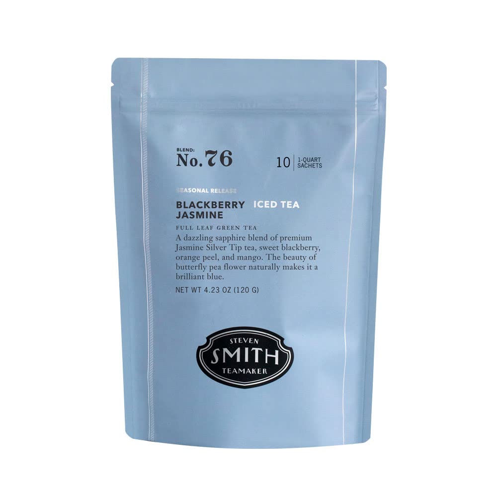 - Blackberry Jasmine Iced Tea No. 76: Contains 10 iced green tea bag sachets of our blend of green tea, blackberry, mango and orange peel. The butterfly pea flower naturally makes it a brilliant blue