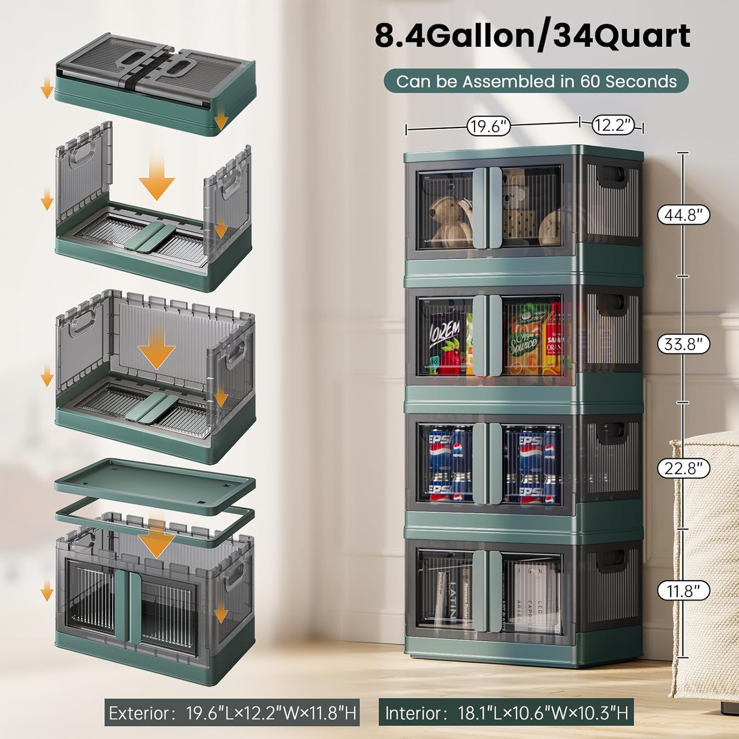 8.4Gal Collapsible Storage Bins with Lids & Wheels - 2 Pack Stackable with Doors, Heavy-Duty Plastic Containers for Home/Office, Green