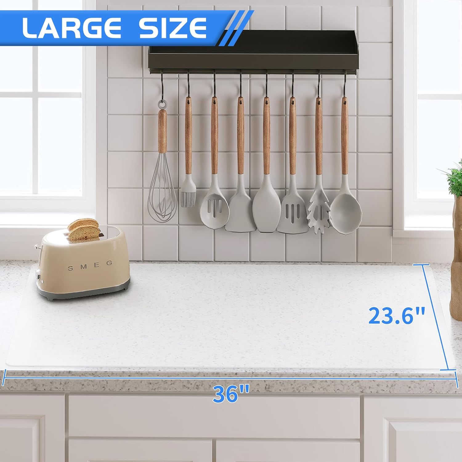 - LARGE, THICK COUNTERTOP MATS - Measures 36" x 23 3/5" x 0.055" (L x W x D) and weighs approximately 1.9 lbs. The large silicone mat covers a large amount of surface for more complete protection of the countertop. The countertop protection mat is thick enough to absorb any kind of impact from fragile dishes or cookware.