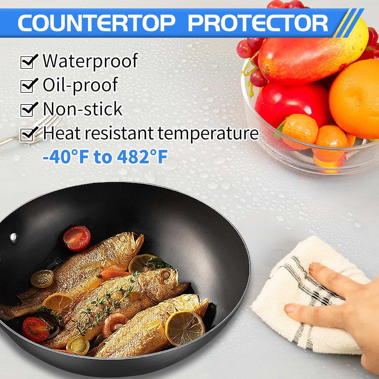 - BEST HEAT RESISTANT MAT - Countertop protector mat can withstand temperatures from -40°F to 482°F. And non-slip, non-stick, and waterproof, protecting your tile, marble, and expensive quartzite countertops from heat, scratches, and stains. The non-slip properties of silicone also ensure that cutting boards, appliances and utensils stay in place.