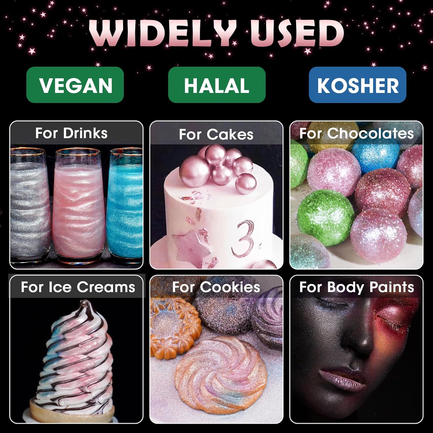 - ✔️【Vegan & Allergen-Free】Food-grade glitter uses only the highest quality vegan ingredients and does not contain common food allergens, including gluten, nuts or dairy products, so everyone can use and enjoy this product regardless of diet or food allergies. Unlike food contact glitter, these are 100% edible, so you don't need to worry about using them in your creations to make them sparkle for all.