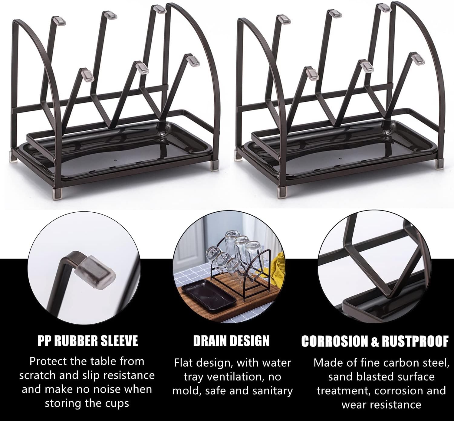 RHBLME 2 Packs Glass Drying Rack, Vertical Bottle Drying Rack Glass Bottle Holder with Drain Tray, Silicone Protective Hooks, Carbon Steel Non Slip Cup Mug Organizer for Glass Coffee Mug Countertop
