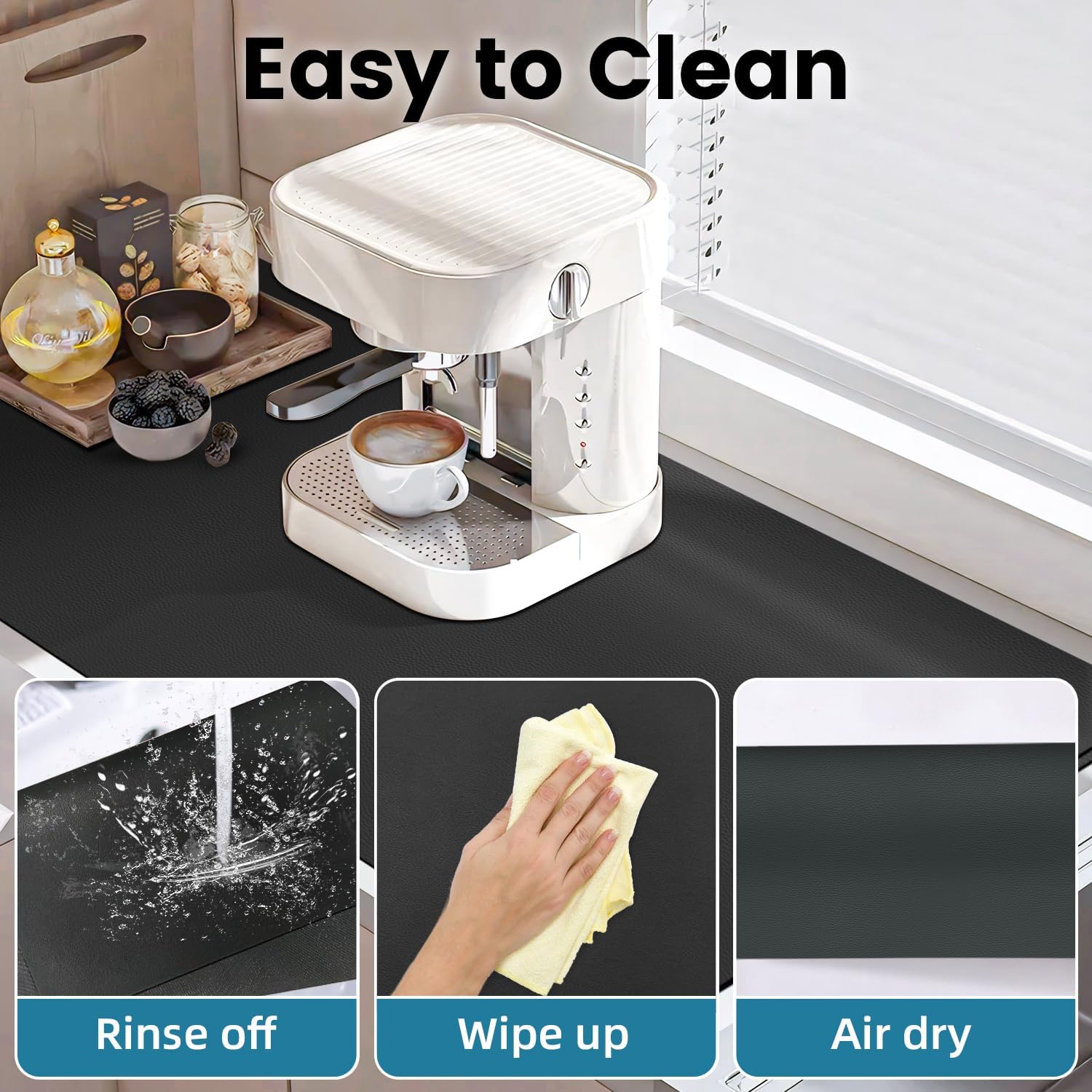 - Super Absorbent and Quick Dry: The coffee bar mats for countertop with absorbent diatomite in middle layer, which quickly absorb liquids and catch splashes. Without worrying about soiling your countertop while making coffee by using under coffee maker mat