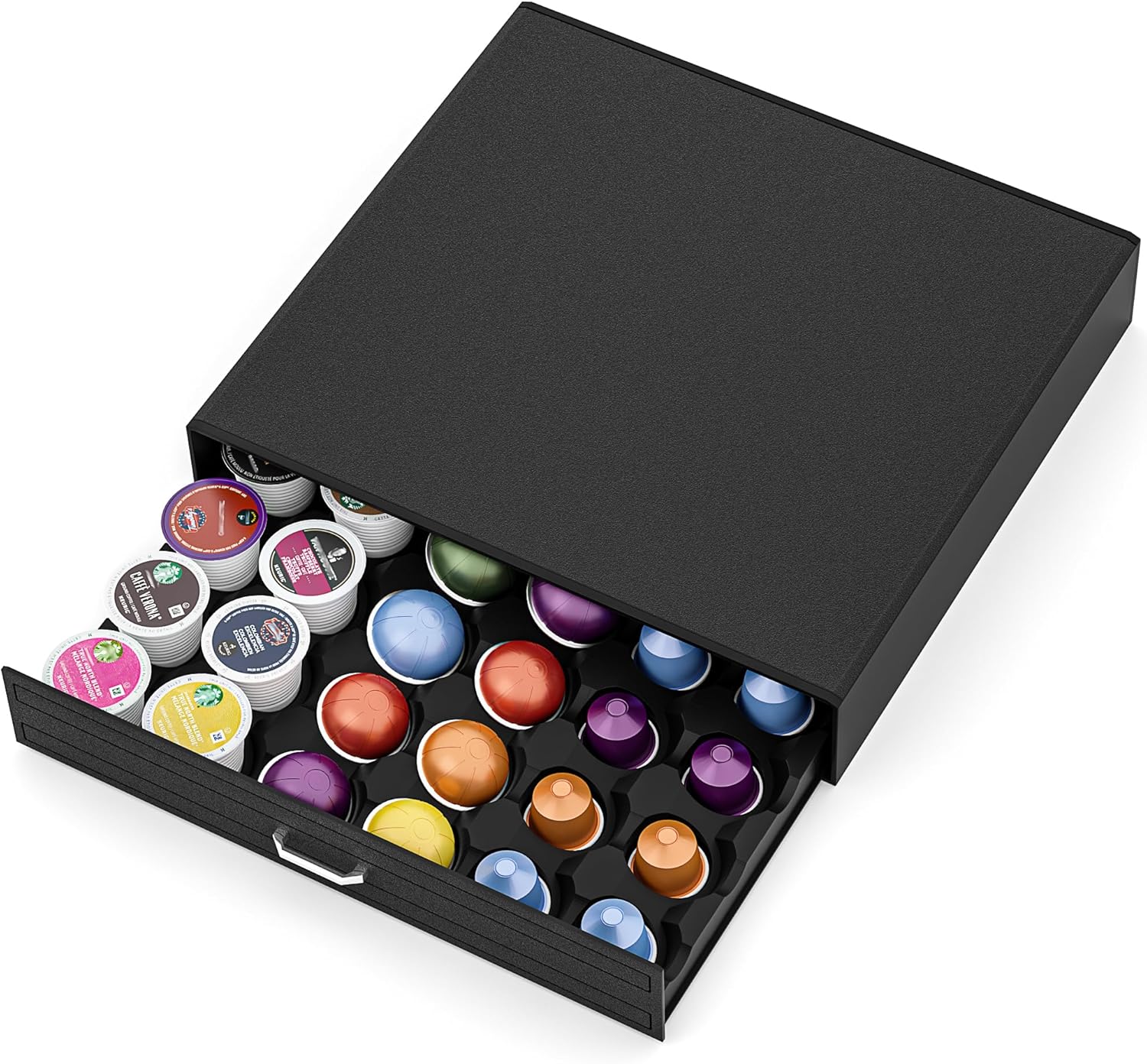 - Versatile Compatibility: Our coffee organizer is compatible with 30 pods for Nespresso Originalline/Vertuoline or 30 K-Cups. One coffee drawer organizer to meet different capsules storage needs, catering to the preferences of any coffee lover.